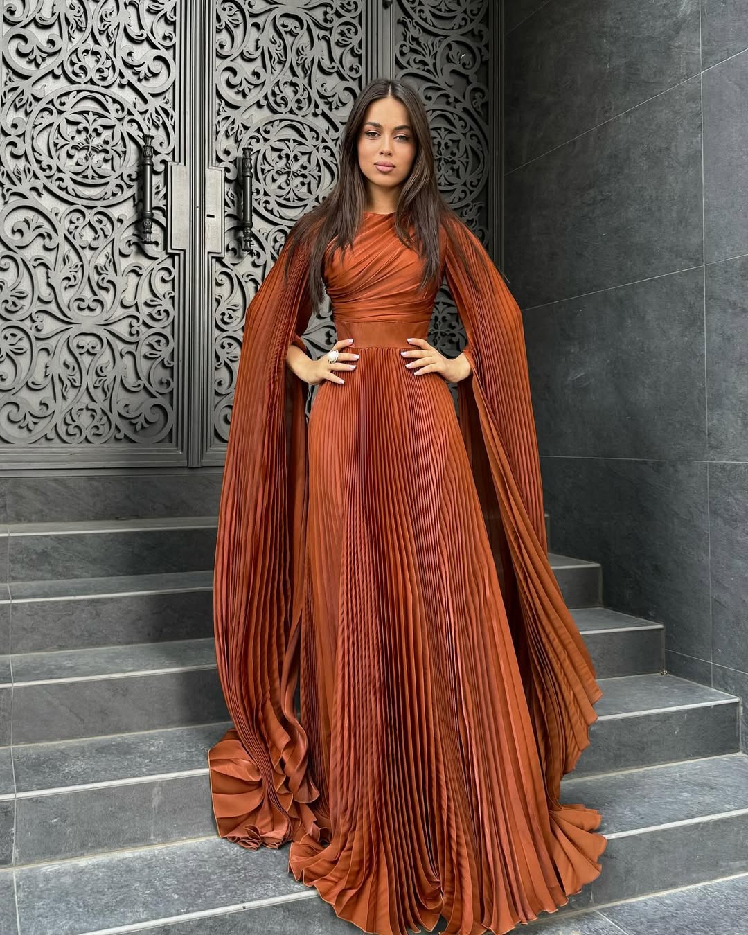 • Sleeves: Statement-making floor-length cape sleeves that open from the shoulder, draped in heavy sunburst pleating for a regal, winged appearance.