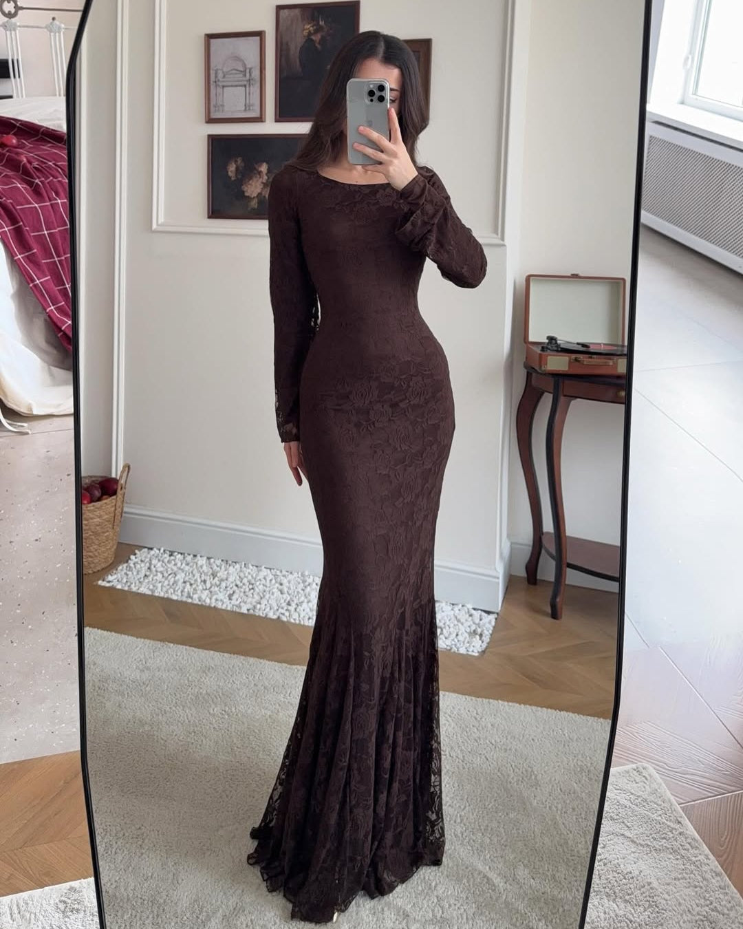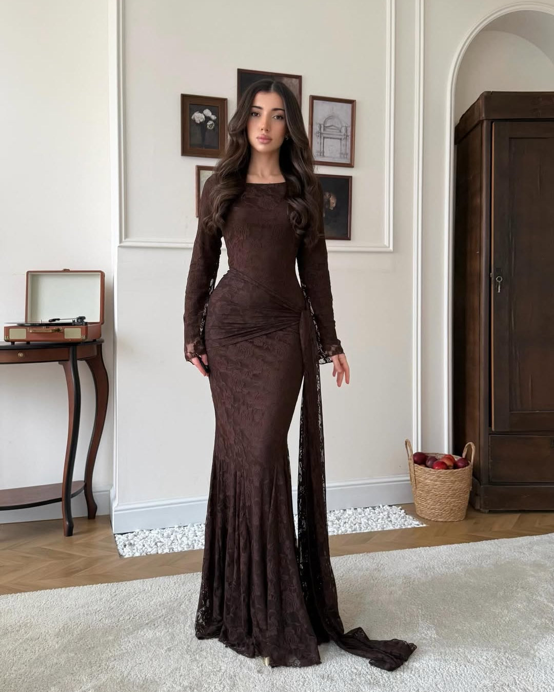 • Skirt: A floor-length mermaid cut that flares slightly at the bottom.