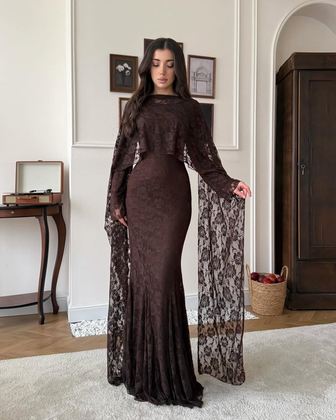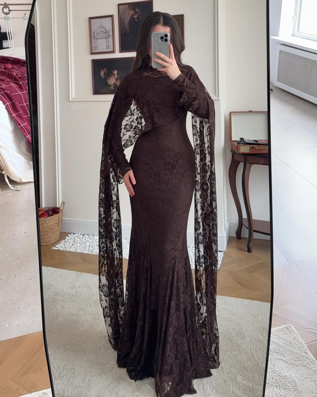 • Sleeves: Long, floor-length "angel sleeves" that flow from the cape.