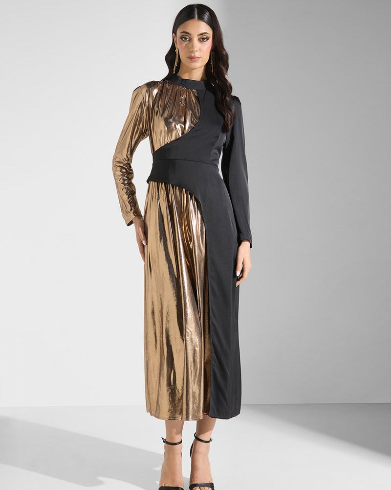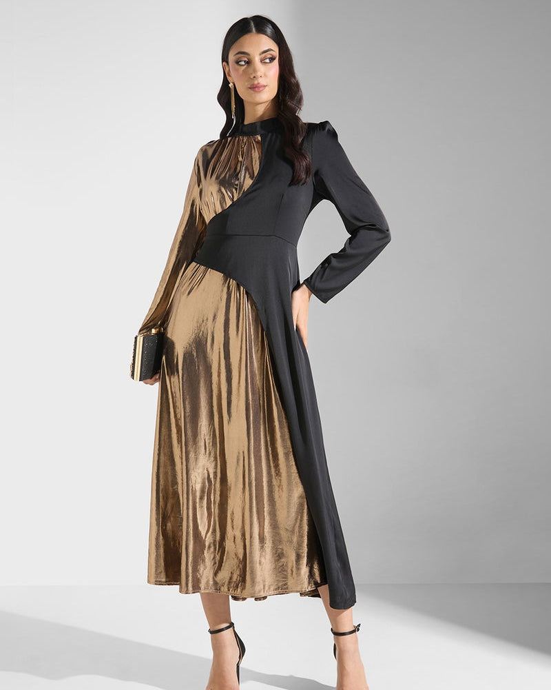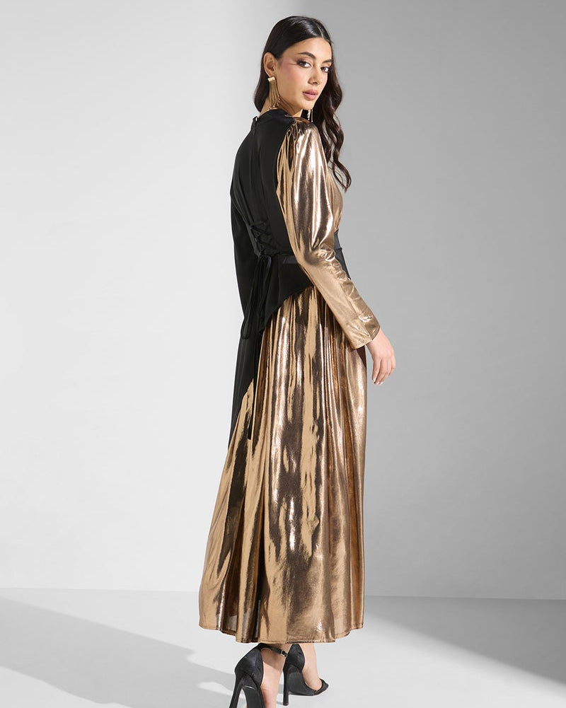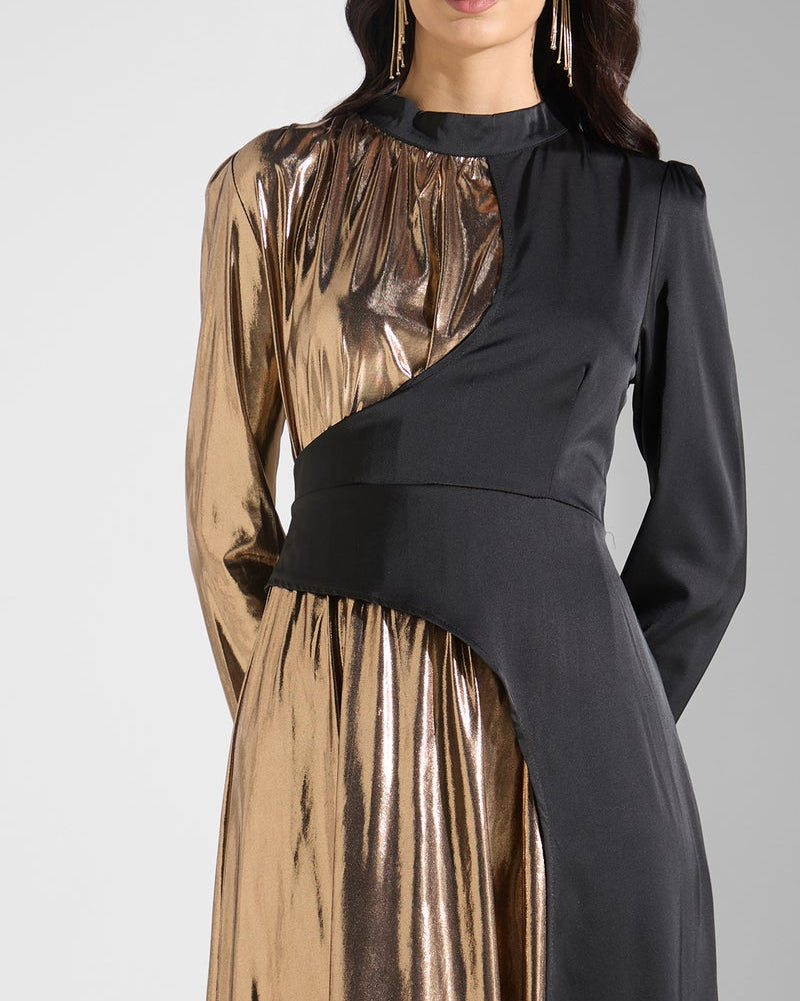 • Architectural High Neck: A sophisticated mock-neck collar that anchors the bodice and adds a regal touch.
