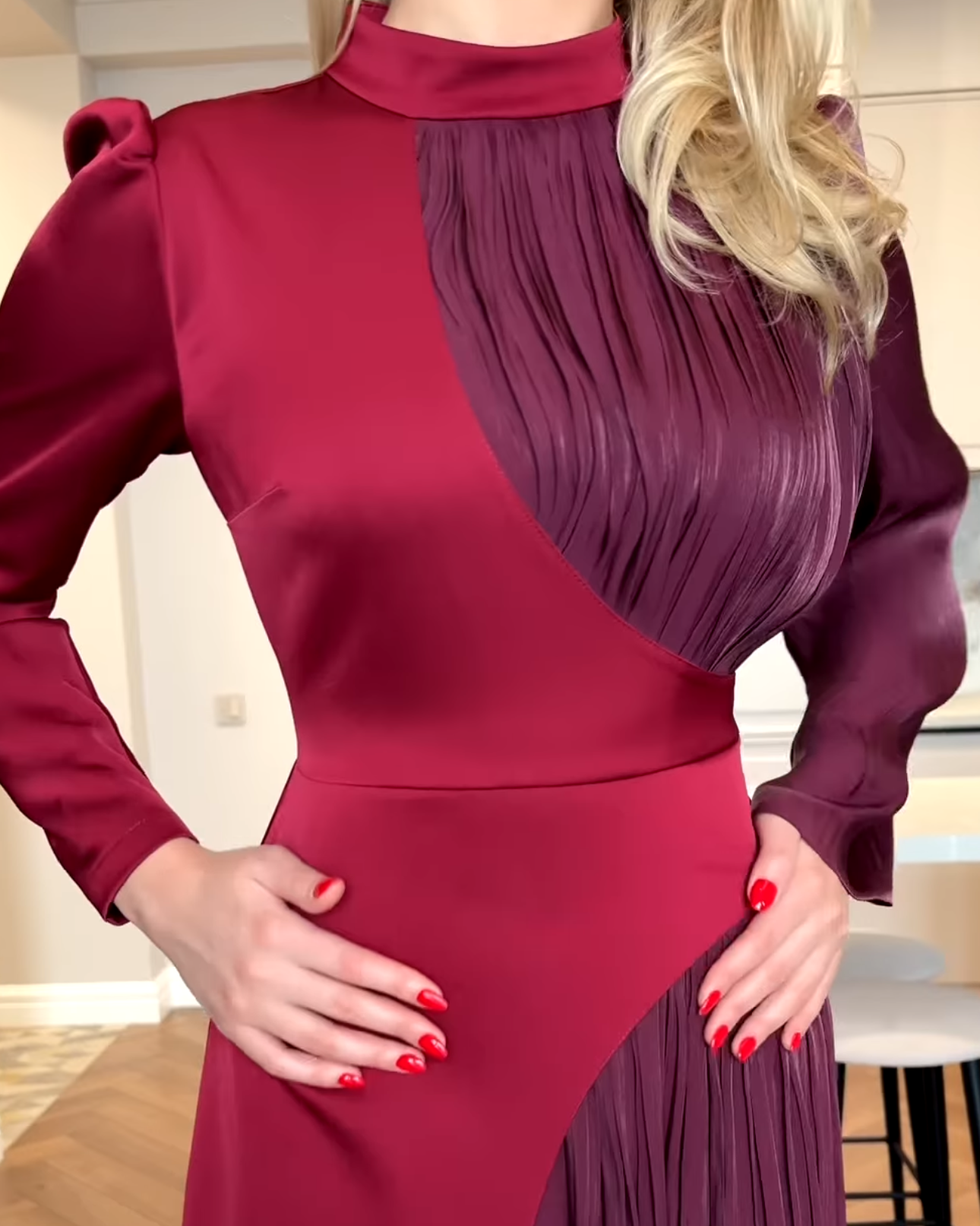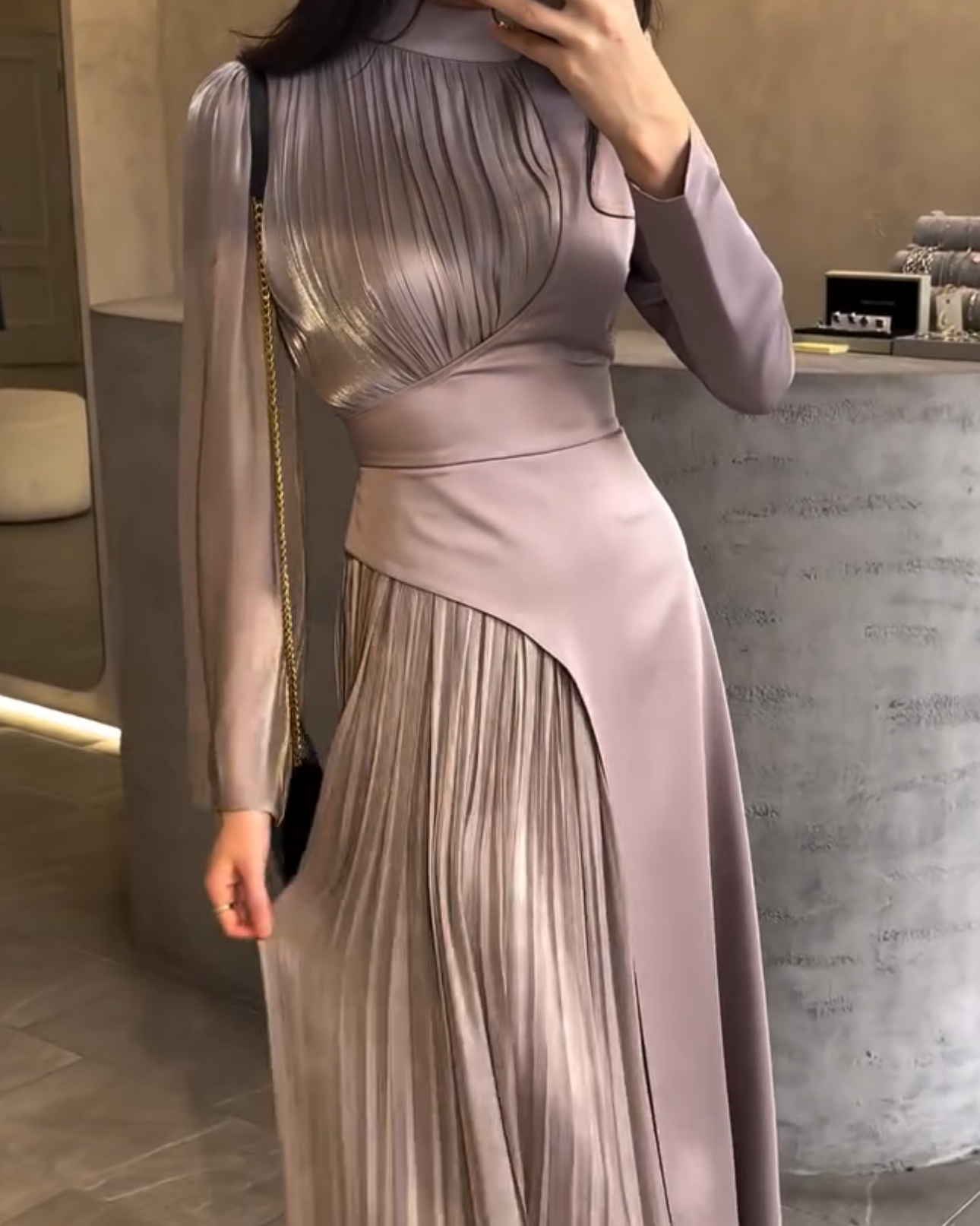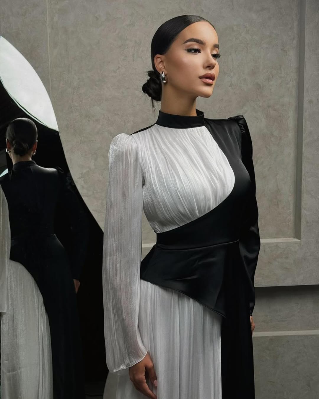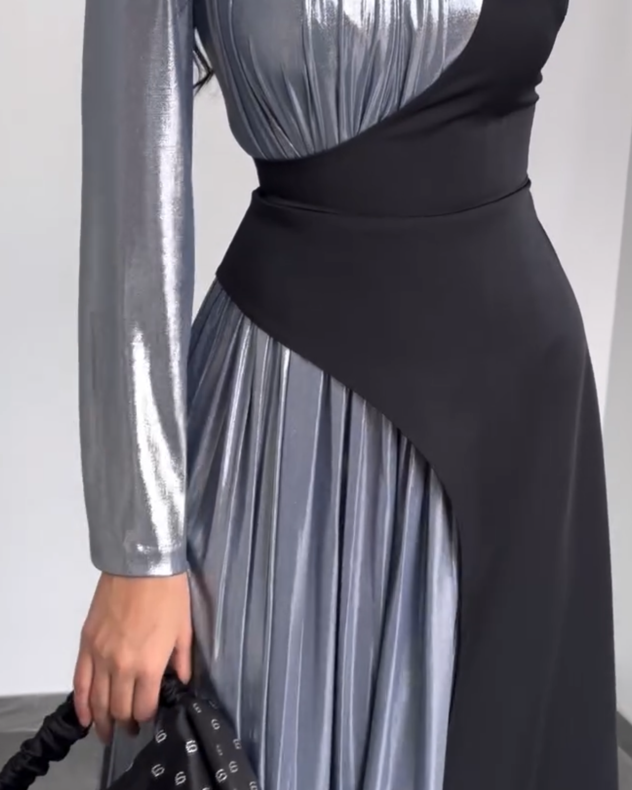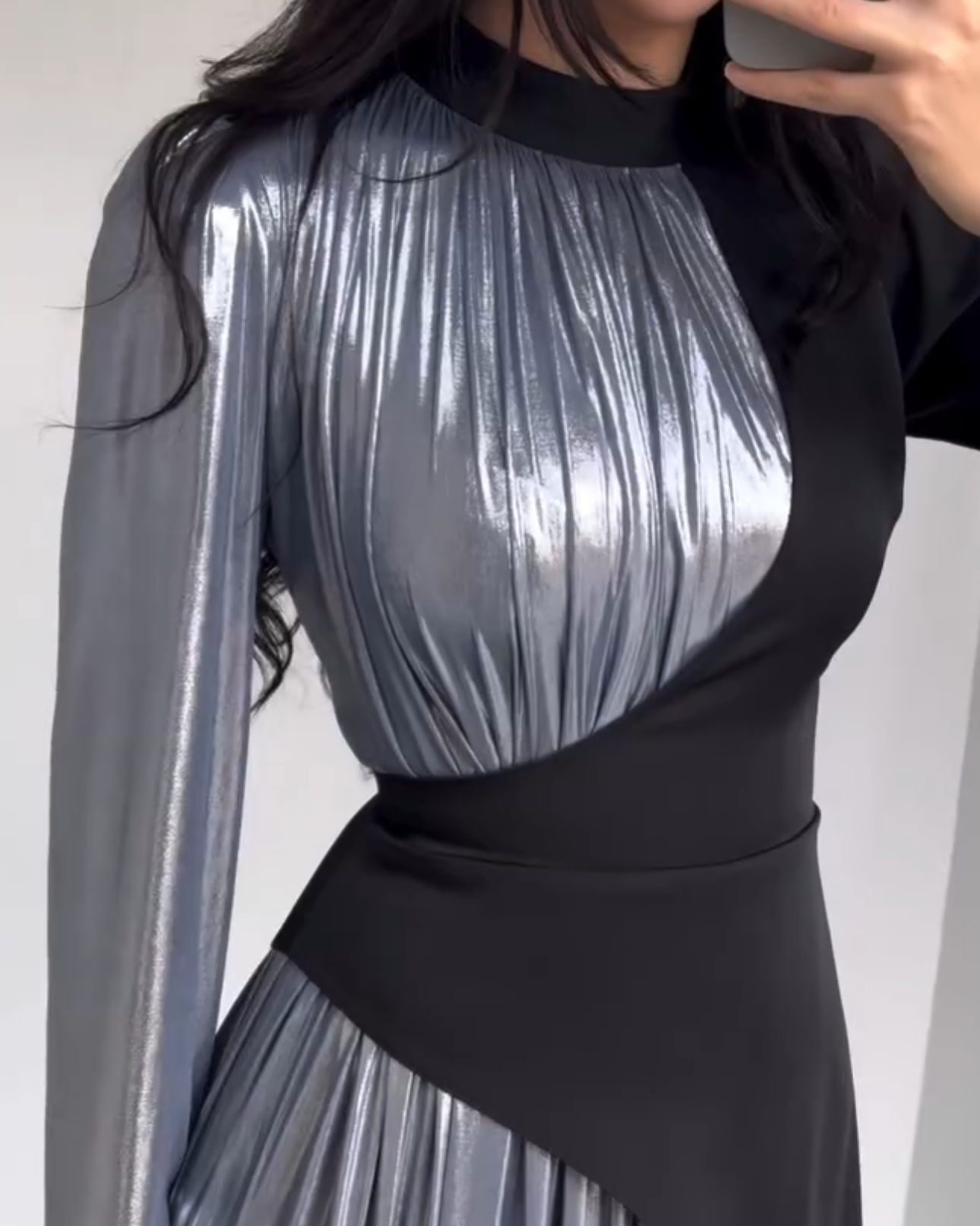 • The "Dual-Nature" Sleeve: One side features a sleek, tailored fit, while the other transitions into a voluminous, cascading plissé sleeve.