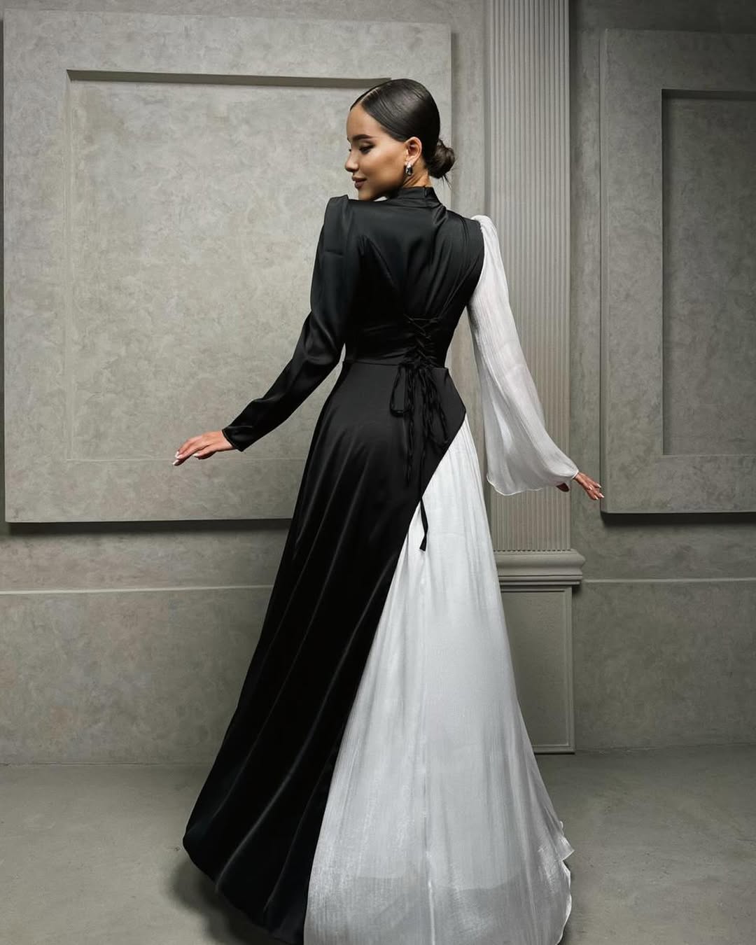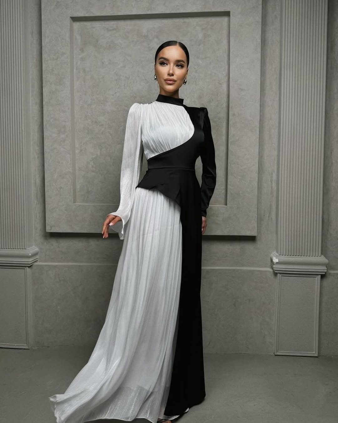 • Asymmetrical Fusion: Features a striking diagonal bodice that merges a structured, form-fitting side with a fluid, ethereal drape.
