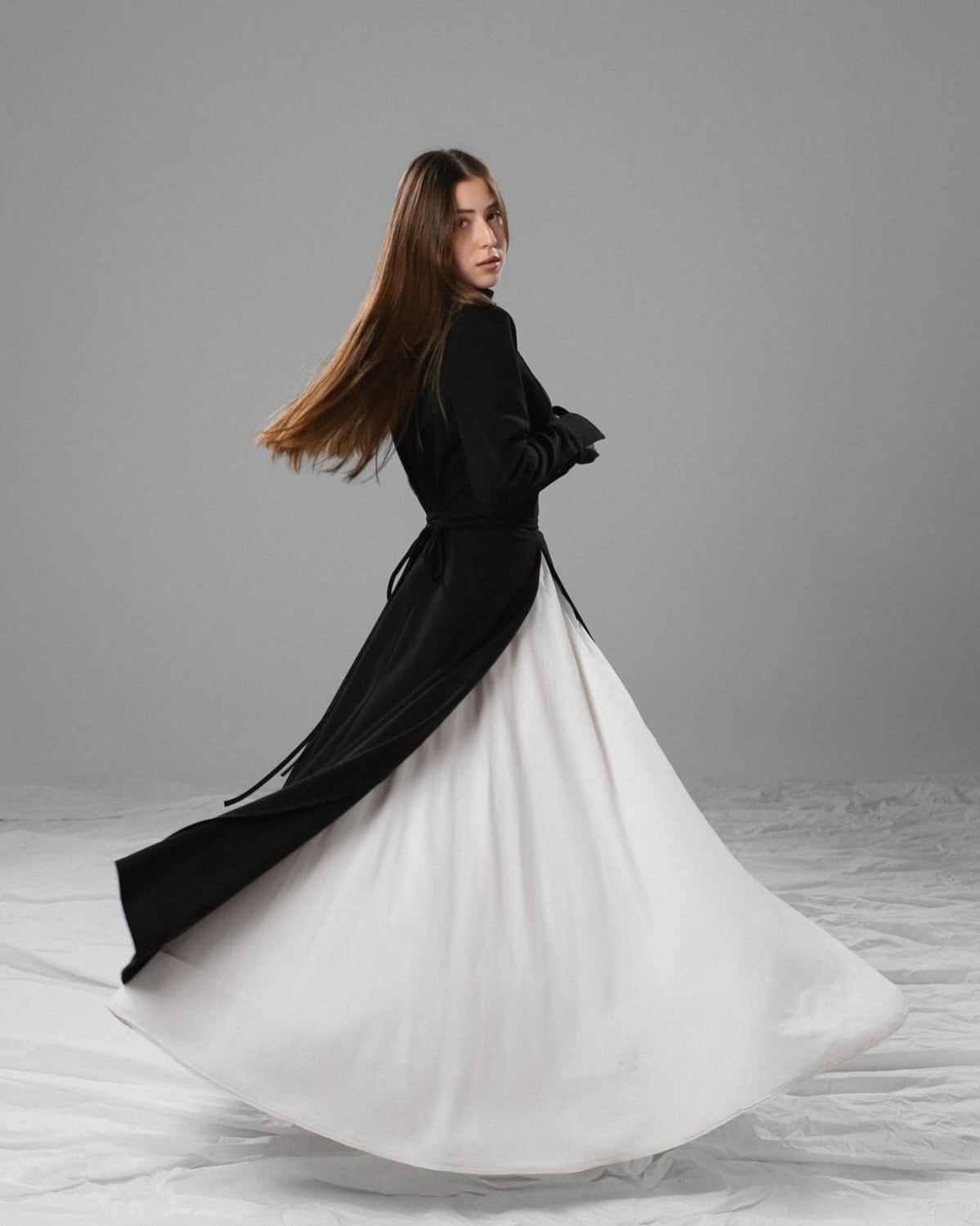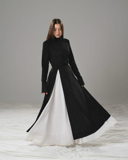 • Fabric: The outer black layer appears to be a heavy matte crepe or velvet for a structured look, while the inner white layer is a lighter, flowing chiffon or silk that catches movement.