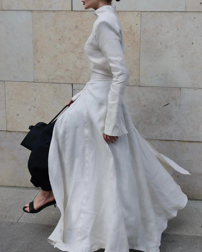 • Design & Silhouette: A high-contrast, two-piece illusion maxi dress. It features a full-length turtleneck bodice with a slim fit that flows into an expansive, floor-length skirt.