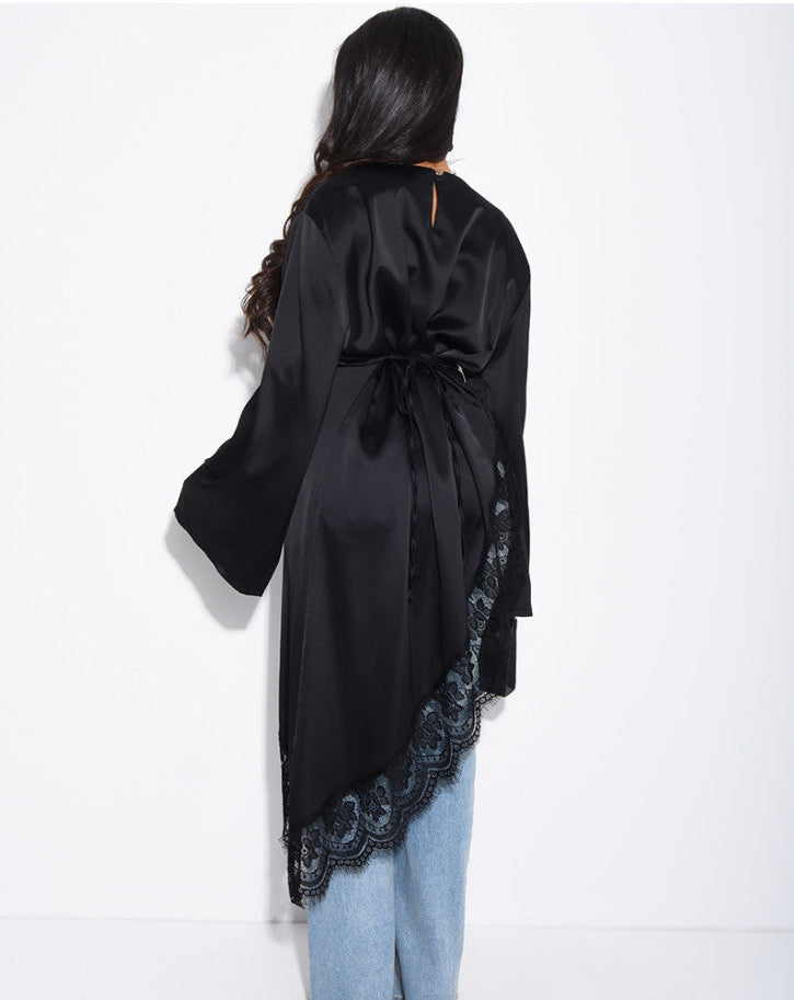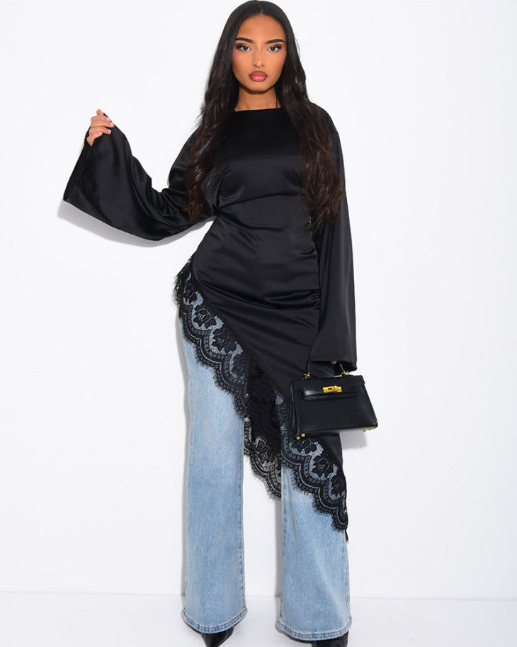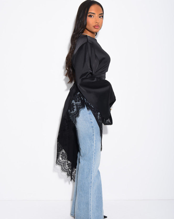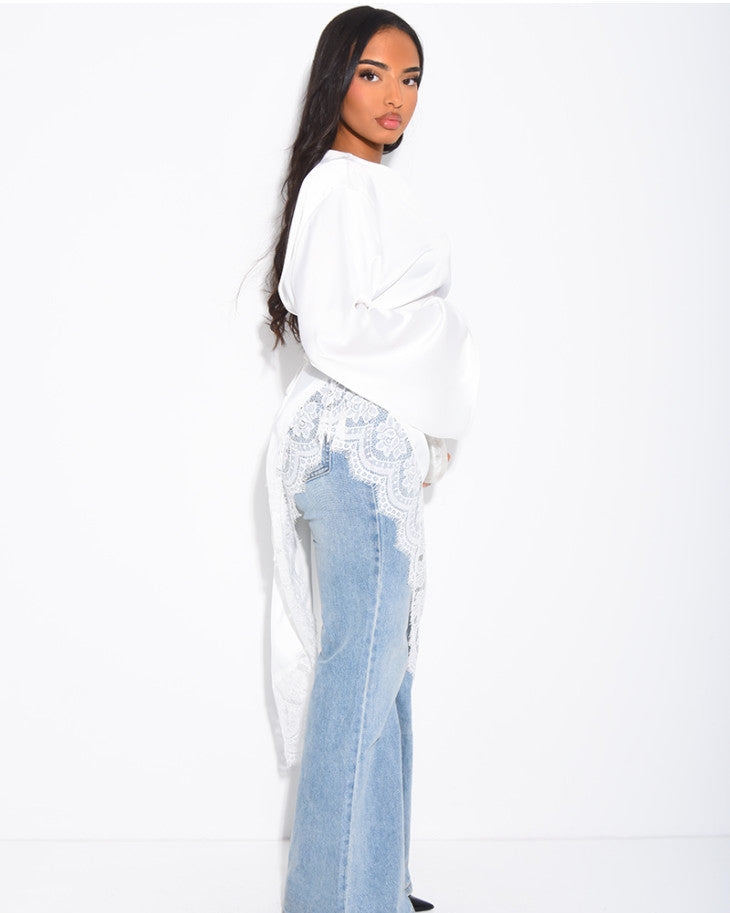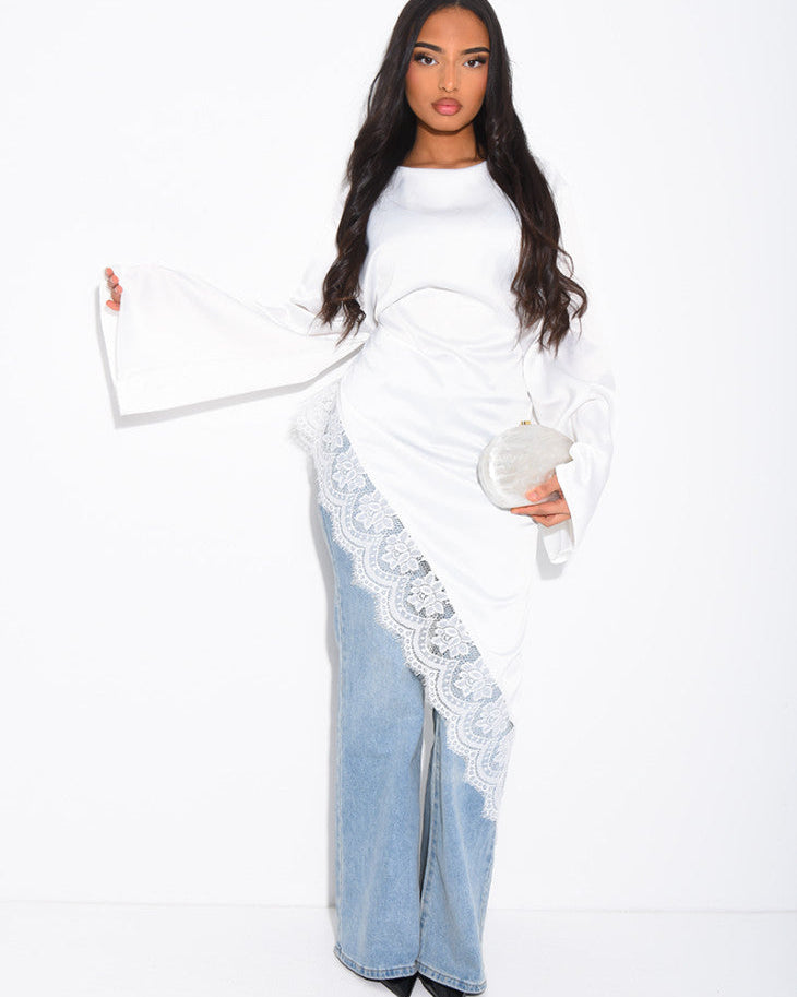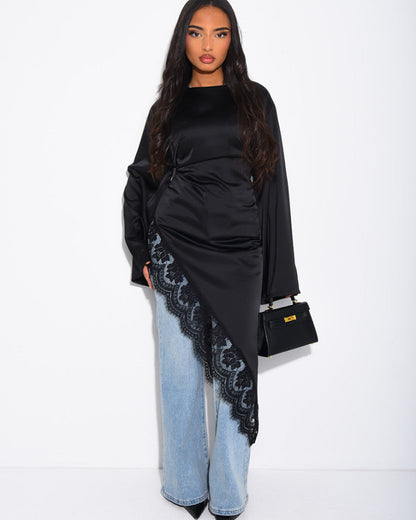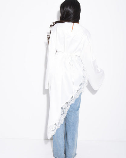 • Detailing: Scalloped Floral Lace Border. A wide, intricate lace trim runs along the entire length of the asymmetric hem, providing a delicate, vintage-inspired contrast to the modern cut.