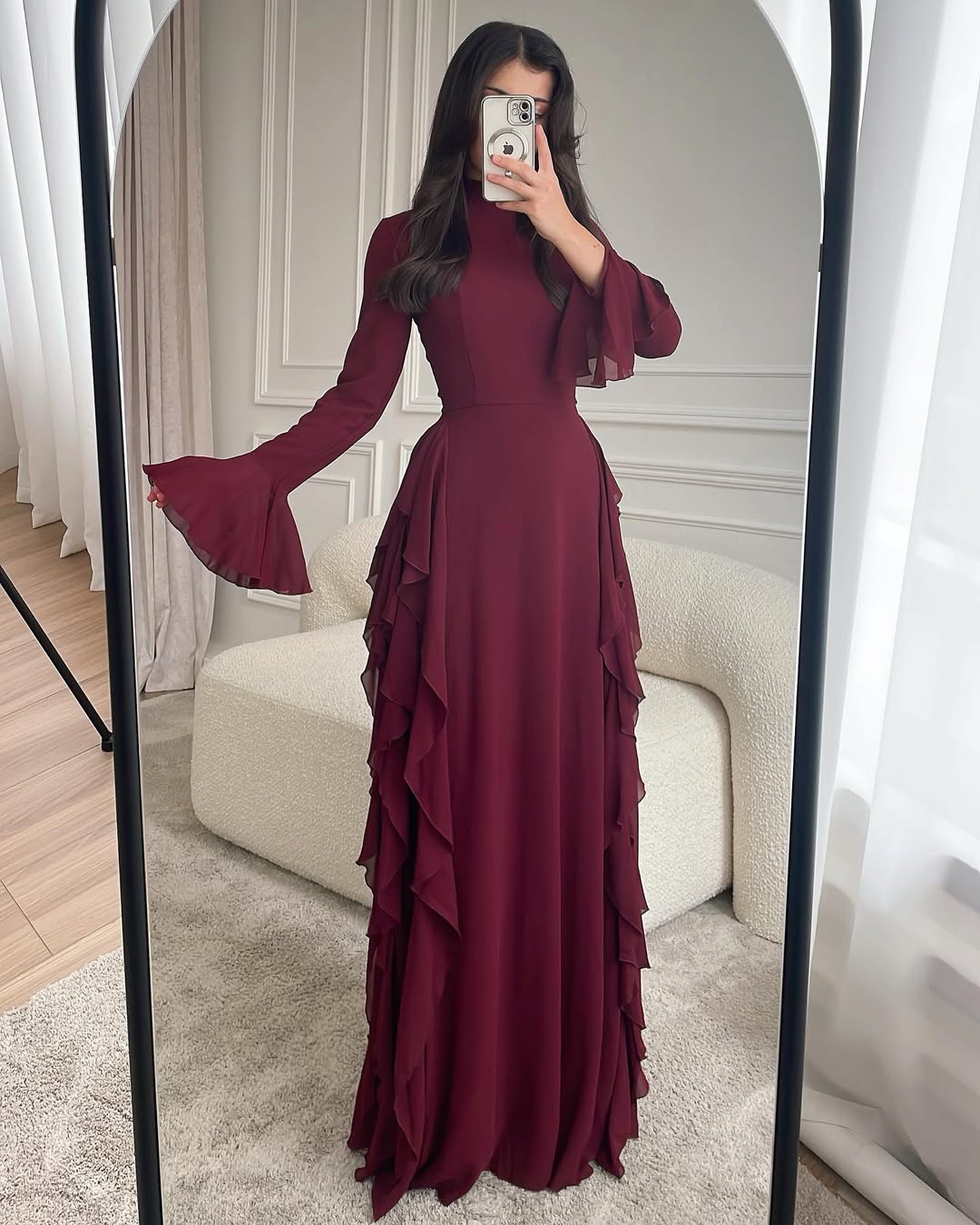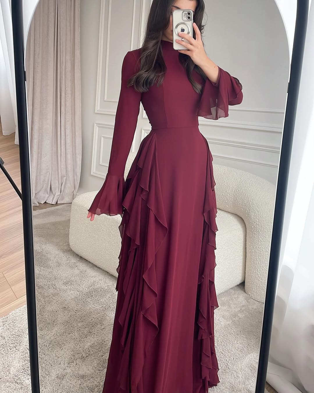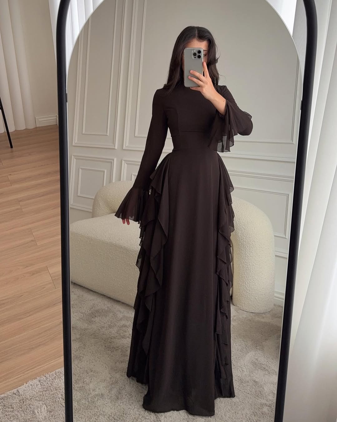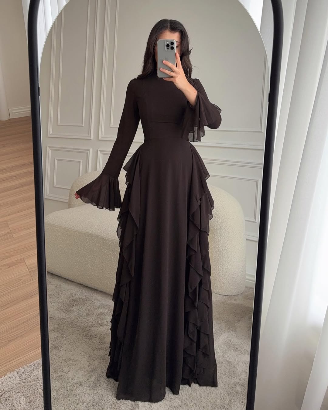 • Side Ruffles: The standout feature consists of vertical cascading ruffles that run down both sides of the hips to the hem.