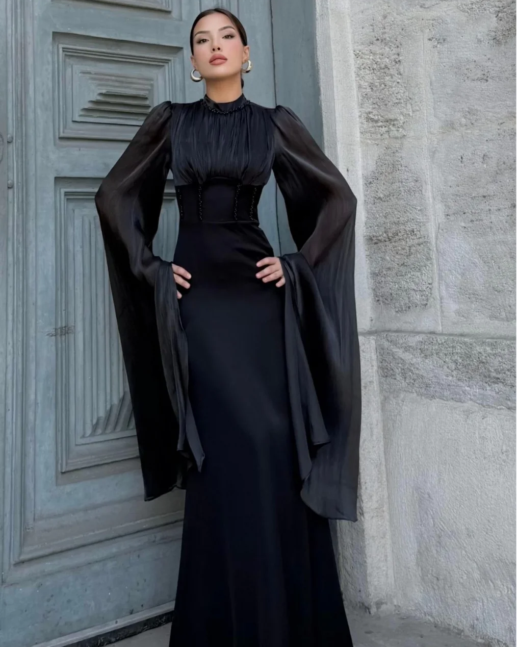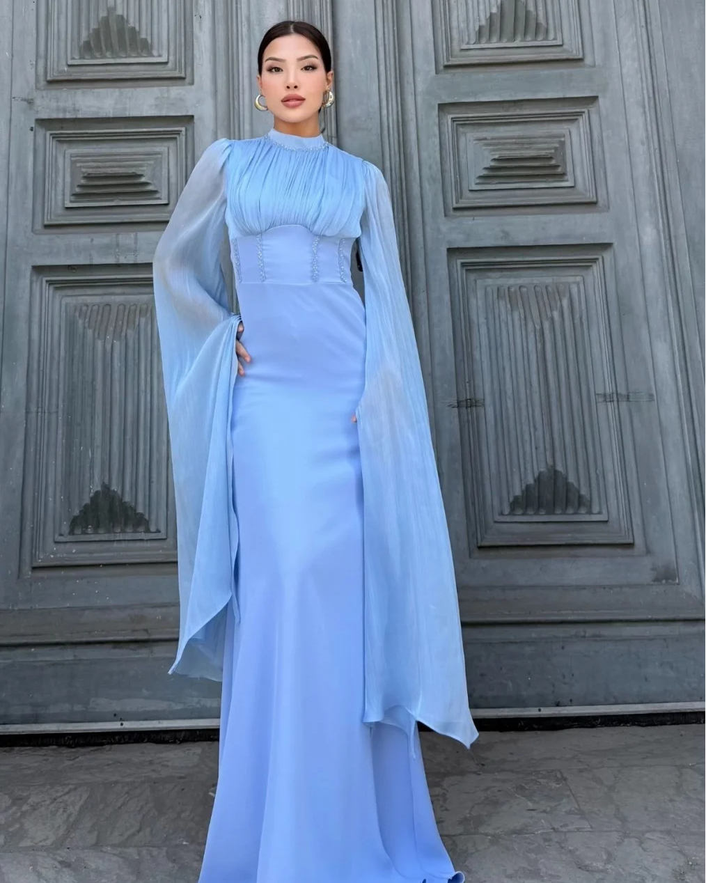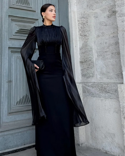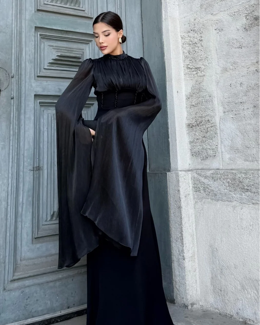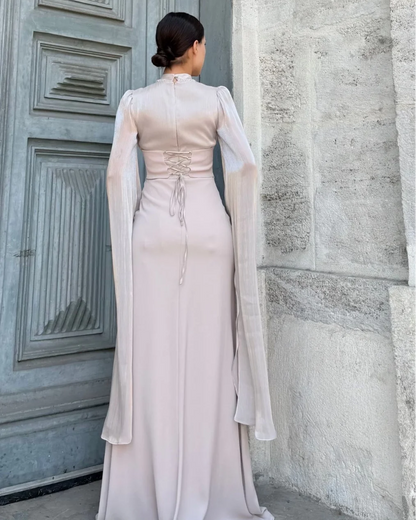 • Sleeve Style: Extraordinary split-wing cape sleeves made from lightweight chiffon. These sleeves are gathered at the shoulder and open into long, trailing panels that create a dramatic "wing" effect with movement.