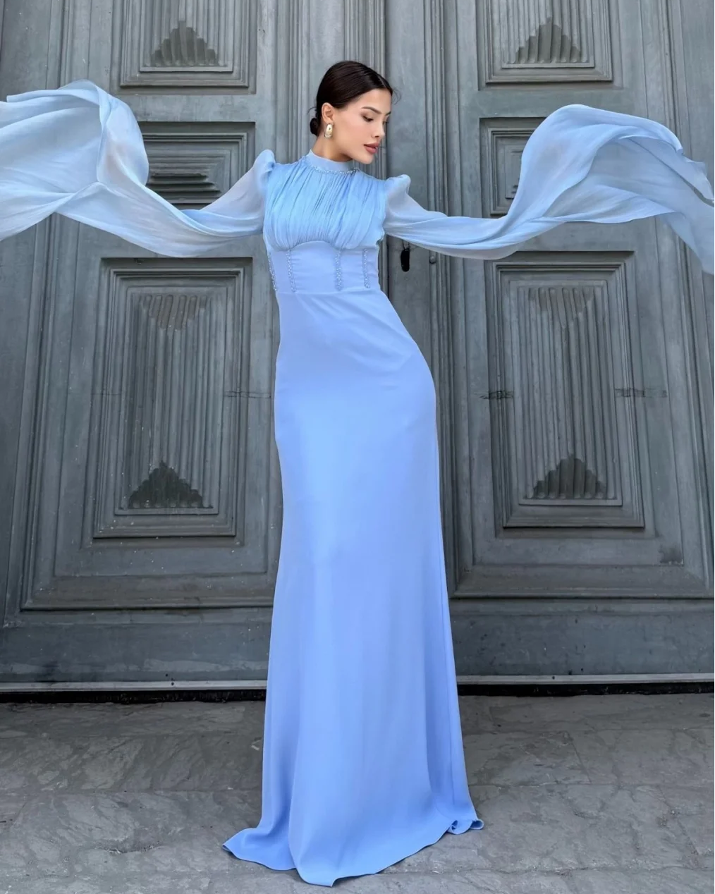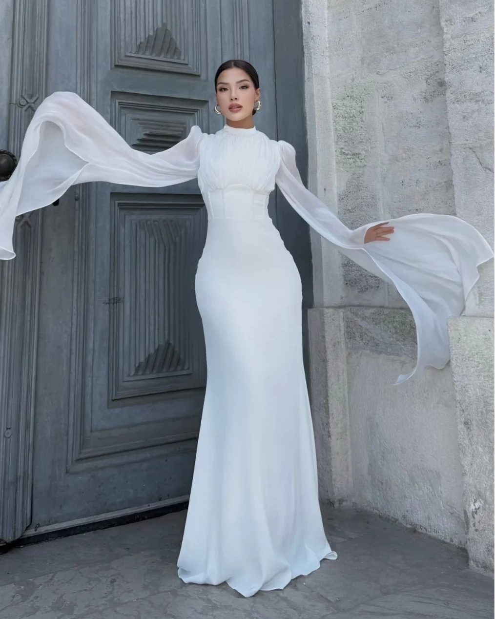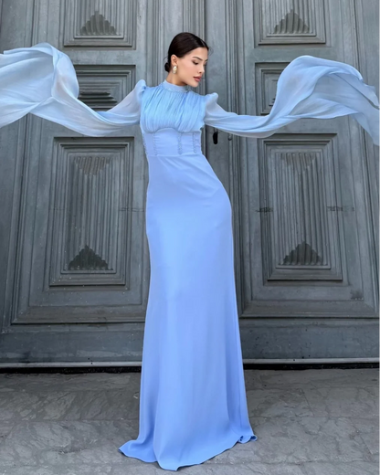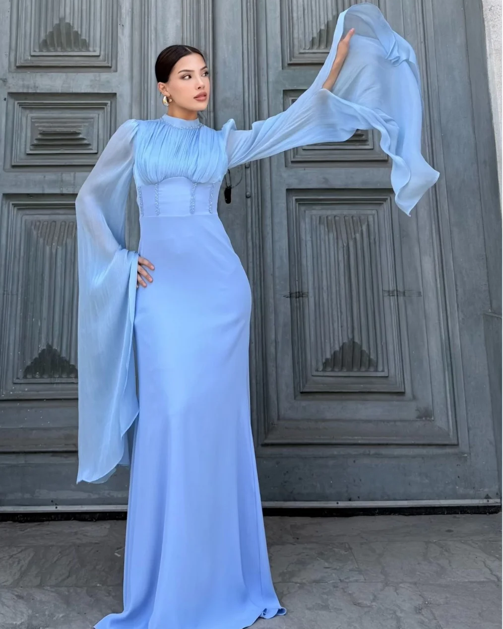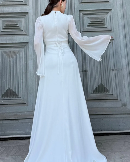 • Sleeve Style: Extraordinary split-wing cape sleeves made from lightweight chiffon. These sleeves are gathered at the shoulder and open into long, trailing panels that create a dramatic "wing" effect with movement.