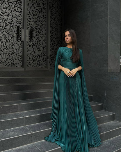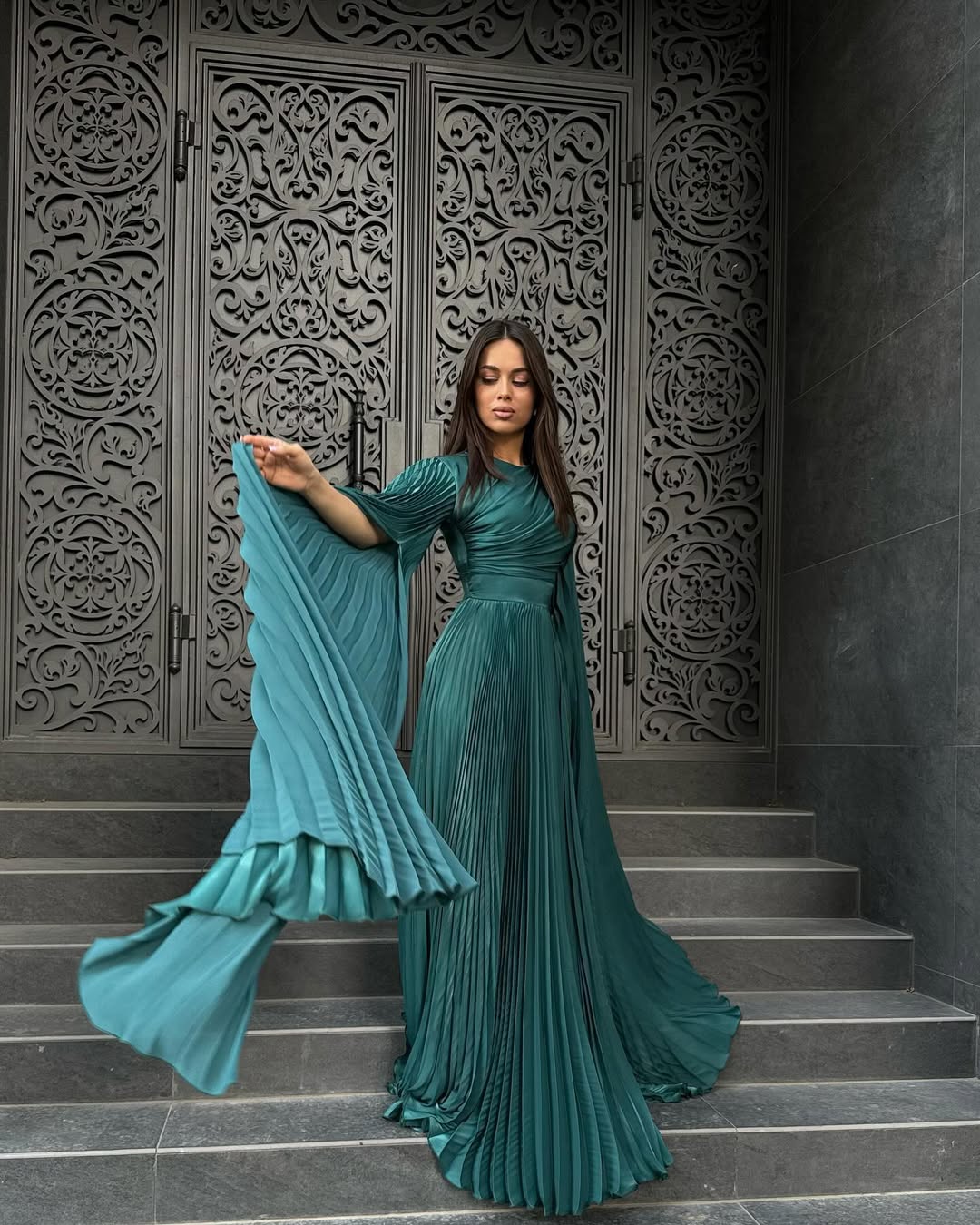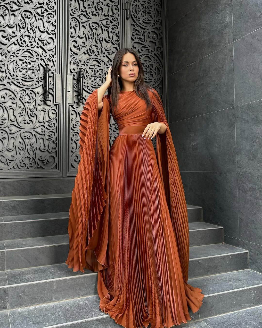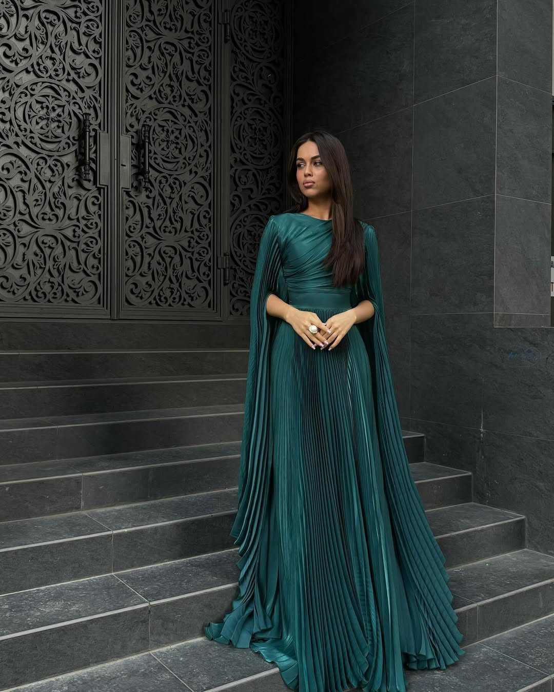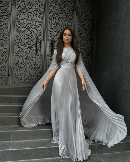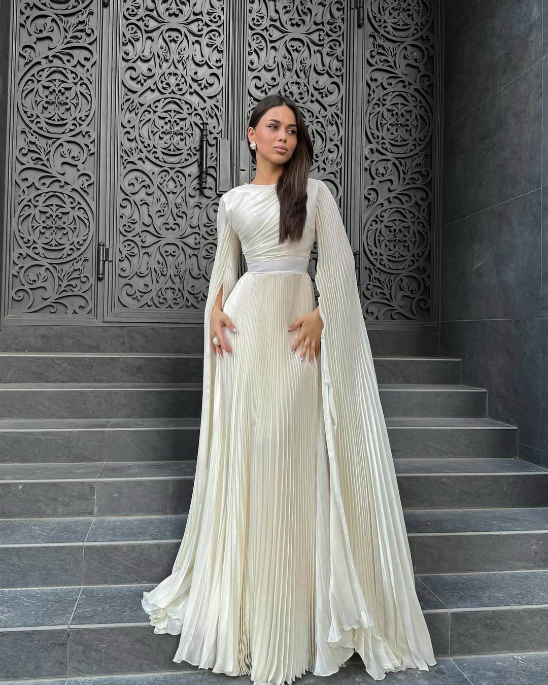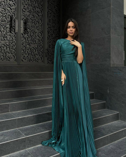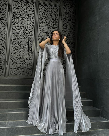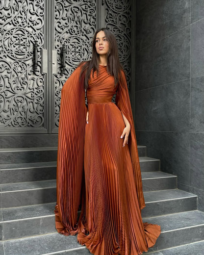 • Sleeves: Statement-making floor-length cape sleeves that open from the shoulder, draped in heavy sunburst pleating for a regal, winged appearance.