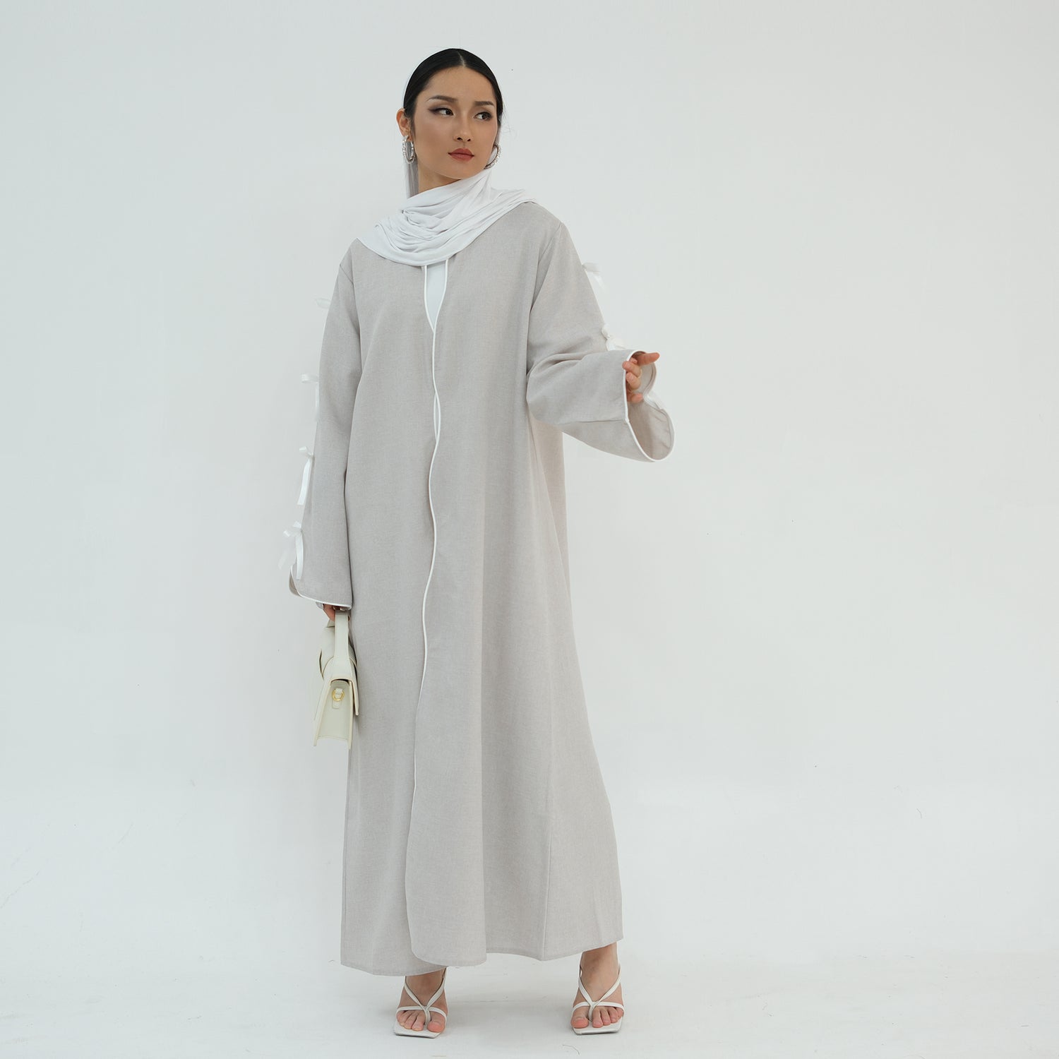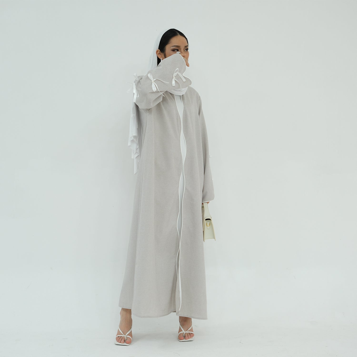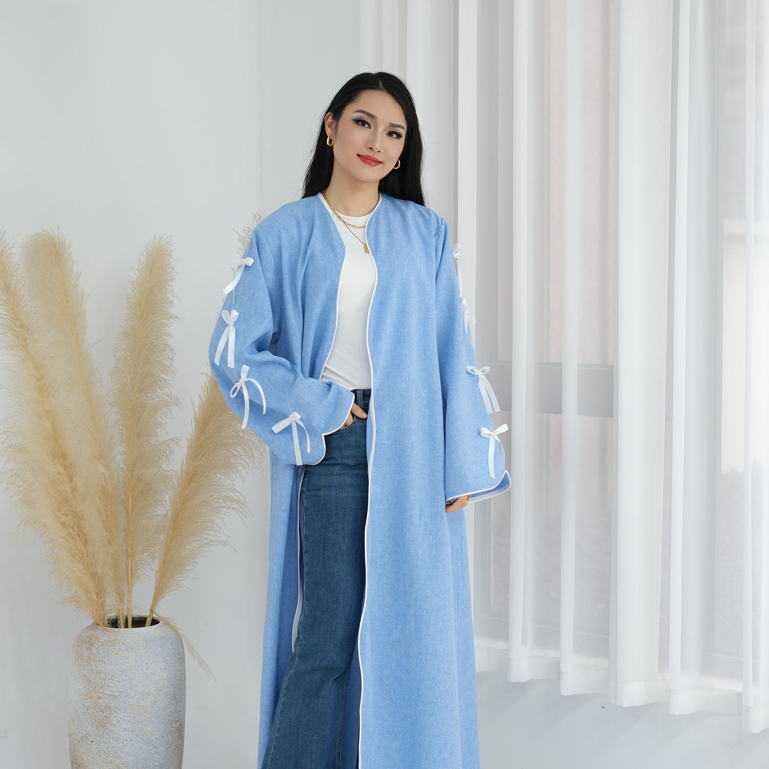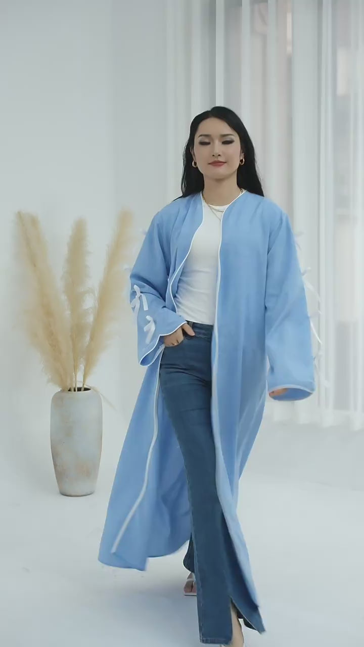 An embodiment of elegance and comfort. This lovely garnment is crafted from linen, and the ribbons are made of beautifull detailed Satin Piece.  This kimono is designed to add a touch of sophistication to your wardrobe. The delicate white ribbon ties along the sleeves offer a playful yet refined look, perfect for enhancing any outfit. Whether dressed up for a special occasion or styled casually for a day out, the 'Lulu' Kimono ensures you look effortlessly chic. Its breathable fabric and loose fit promise both style and comfort, making it a must-have for any fashion enthusiast.