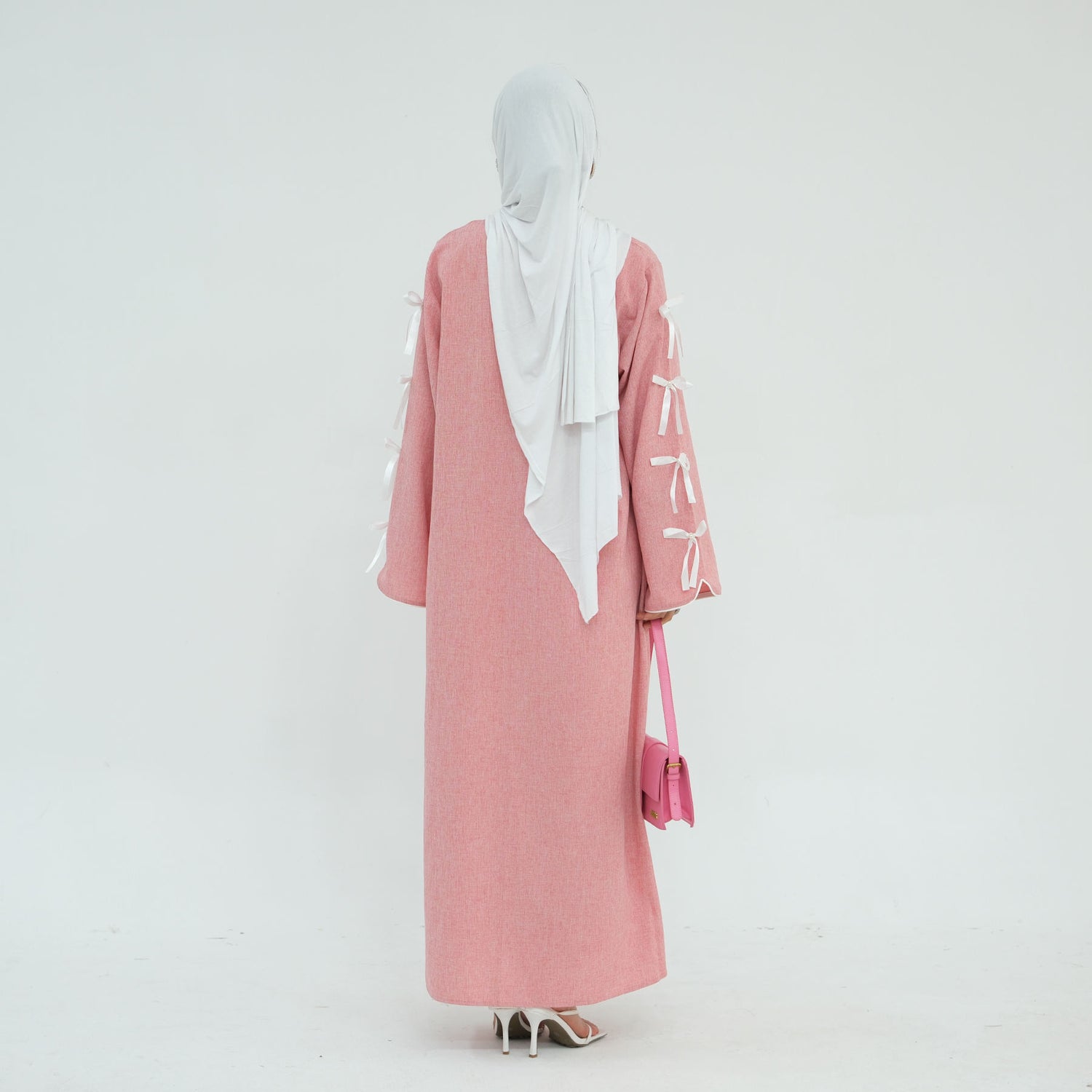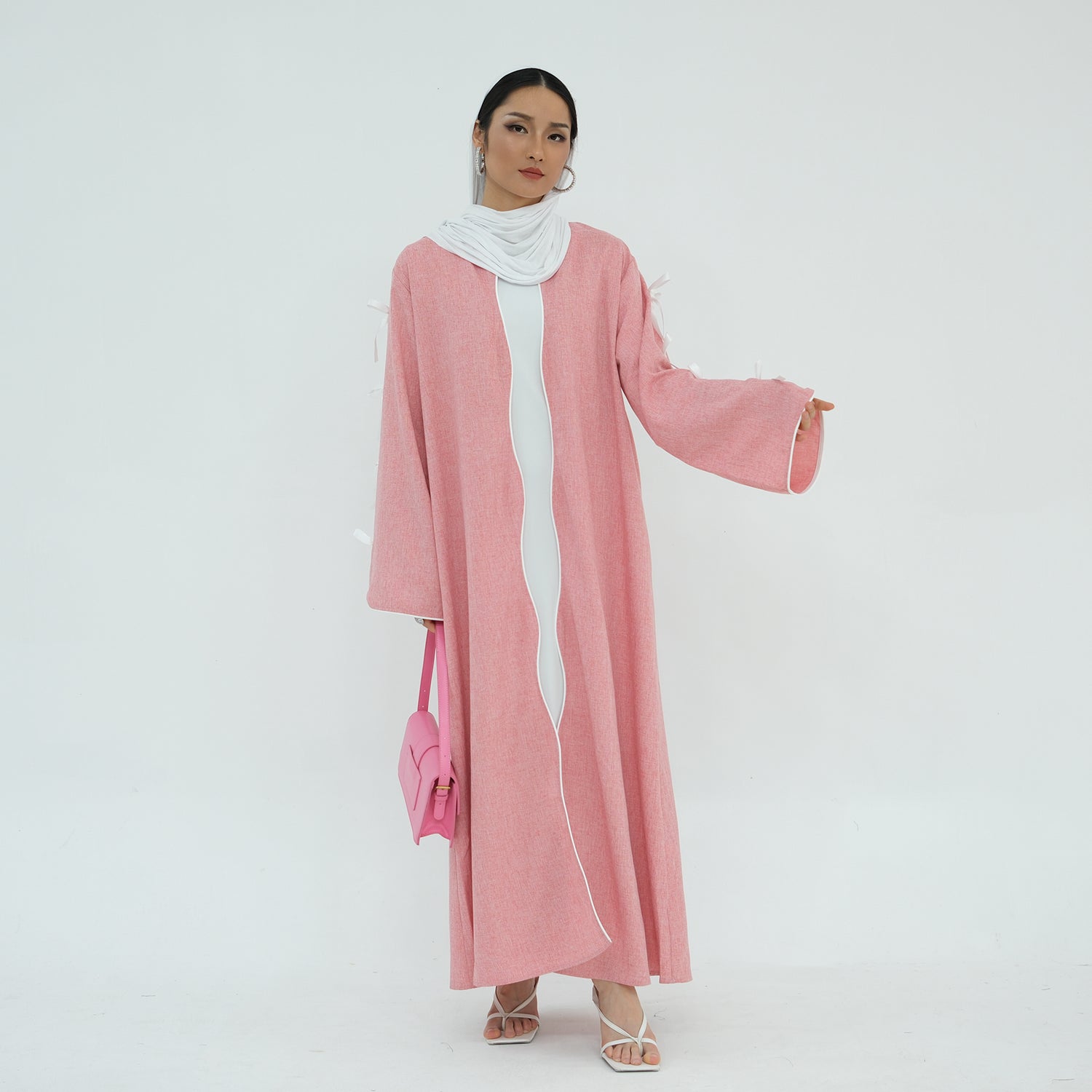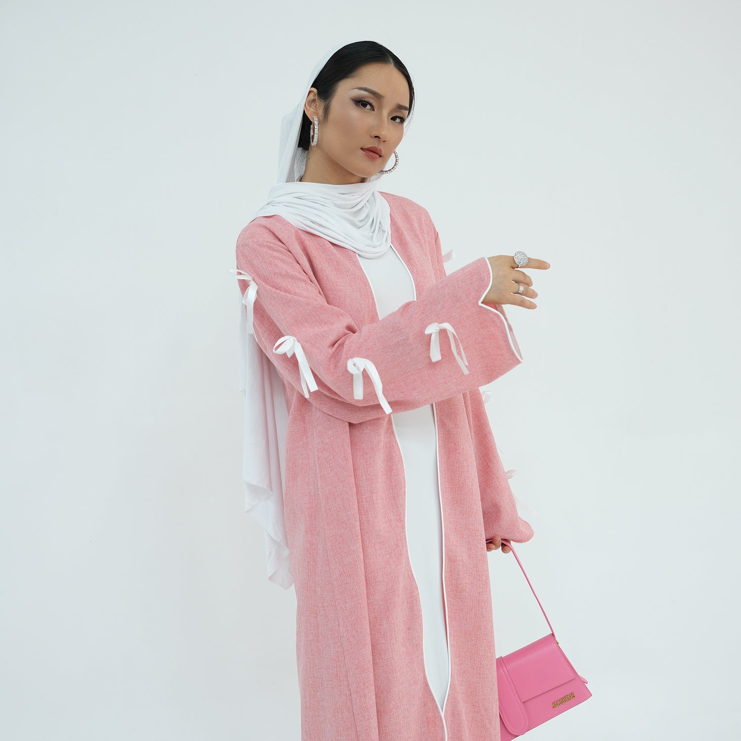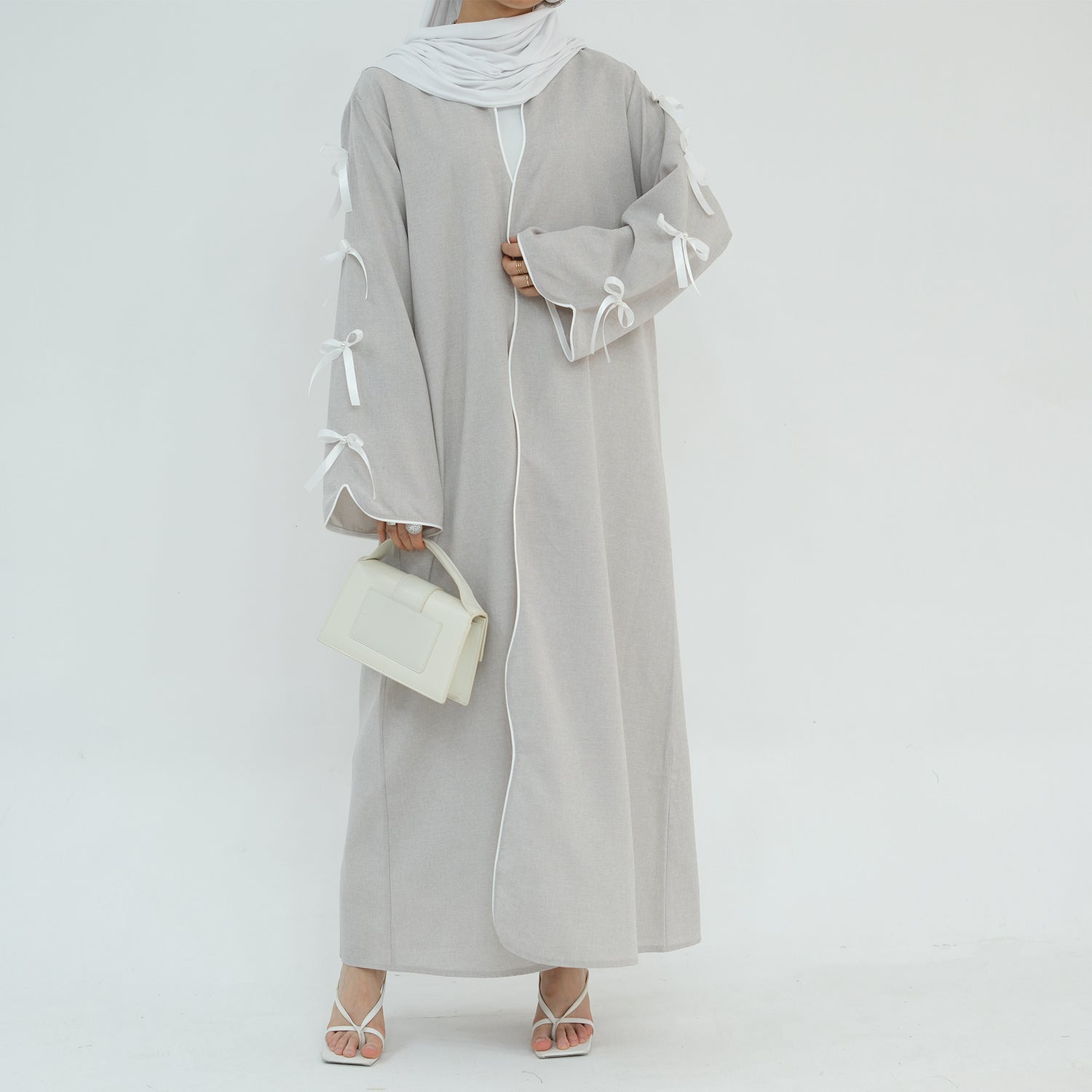 An embodiment of elegance and comfort. This lovely garnment is crafted from linen, and the ribbons are made of beautifull detailed Satin Piece.  This kimono is designed to add a touch of sophistication to your wardrobe. The delicate white ribbon ties along the sleeves offer a playful yet refined look, perfect for enhancing any outfit. Whether dressed up for a special occasion or styled casually for a day out, the 'Lulu' Kimono ensures you look effortlessly chic. Its breathable fabric and loose fit promise both style and comfort, making it a must-have for any fashion enthusiast.