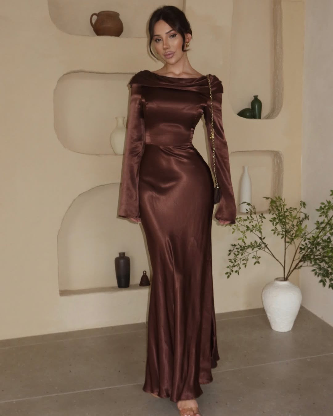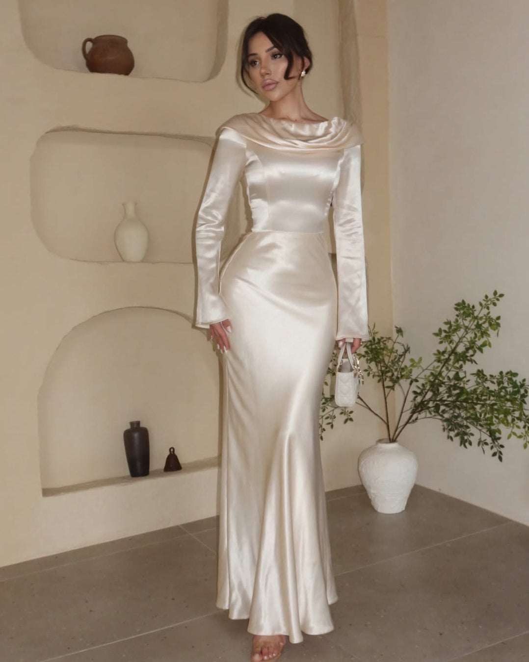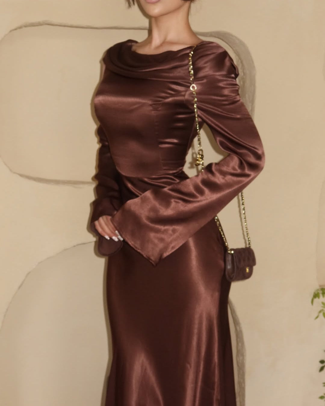 • Neckline: A structured cowl-neck or draped portrait collar that sits wide on the shoulders, creating a graceful frame for the collarbones.