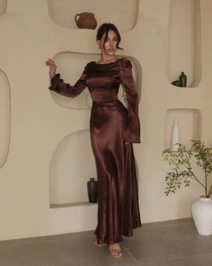 • Material: Heavyweight silk satin or liquid crepe, chosen for its high-luster finish and ability to catch the light with every movement.