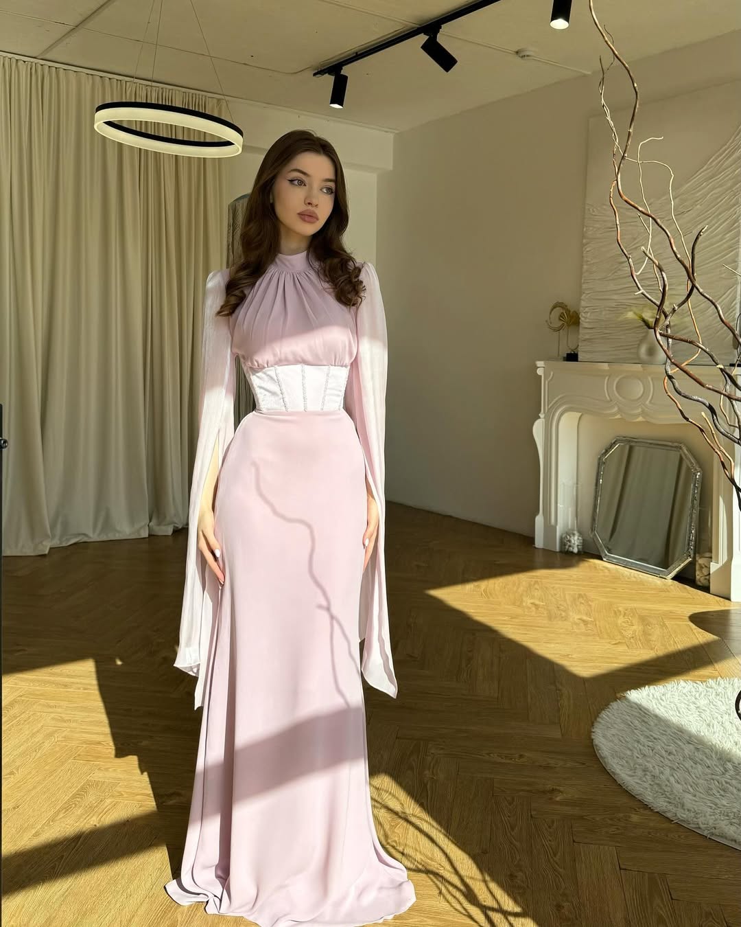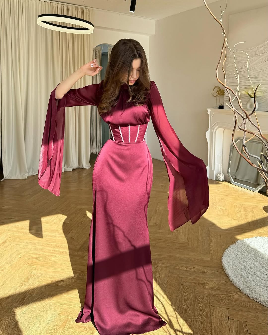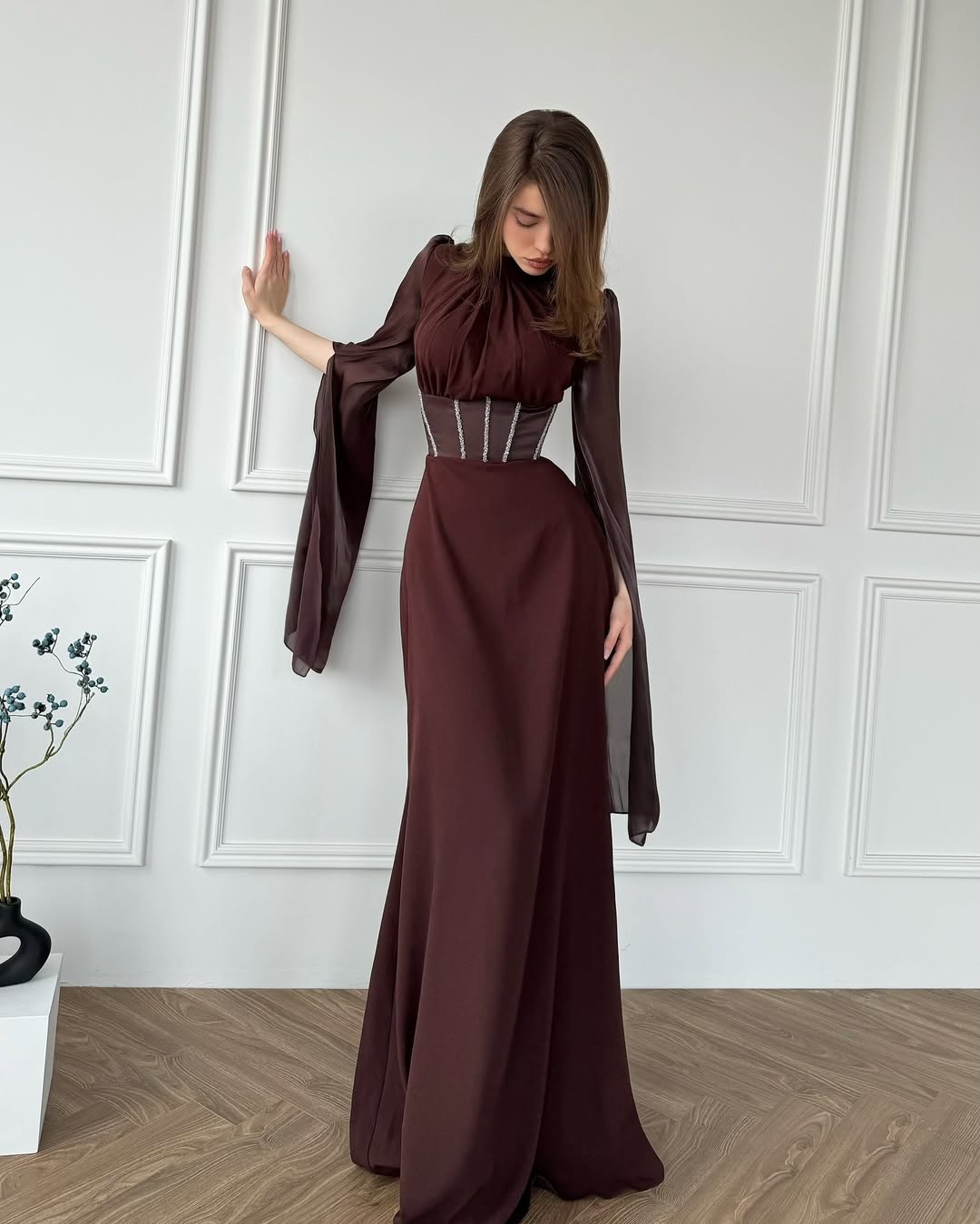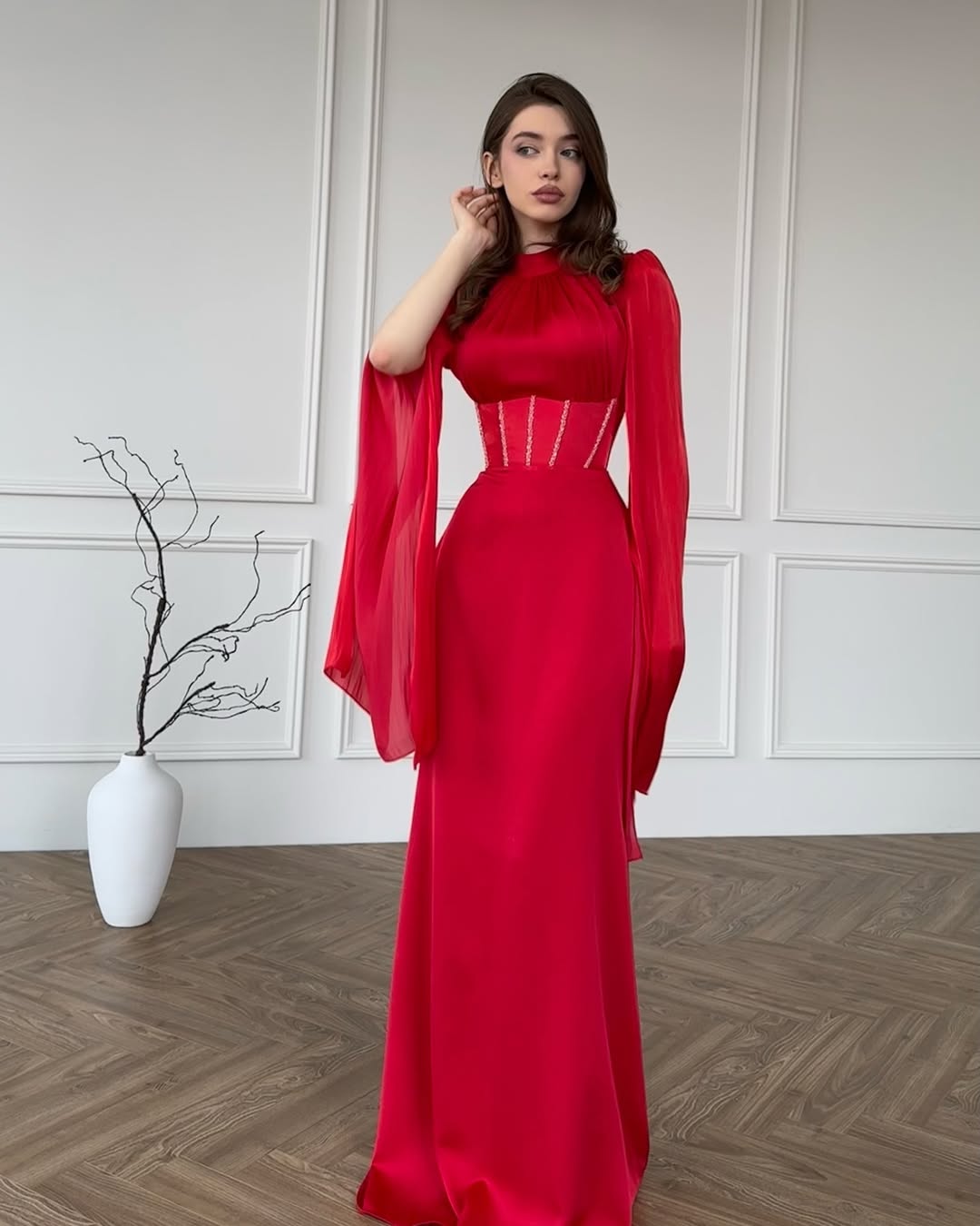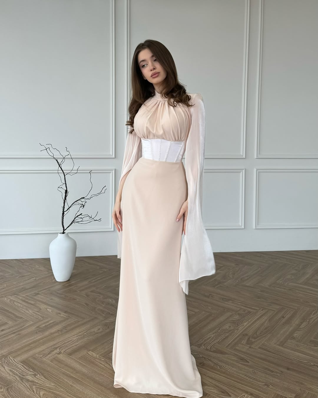 ​The lower half is a column-style maxi skirt with a subtle flare toward the hem. It is designed with a fluid drape, likely made from a heavy crepe or satin-back silk that holds its shape while allowing for a graceful "pool" effect at the feet.