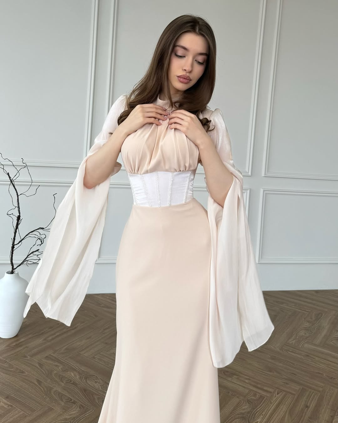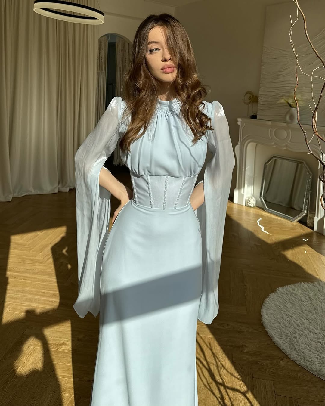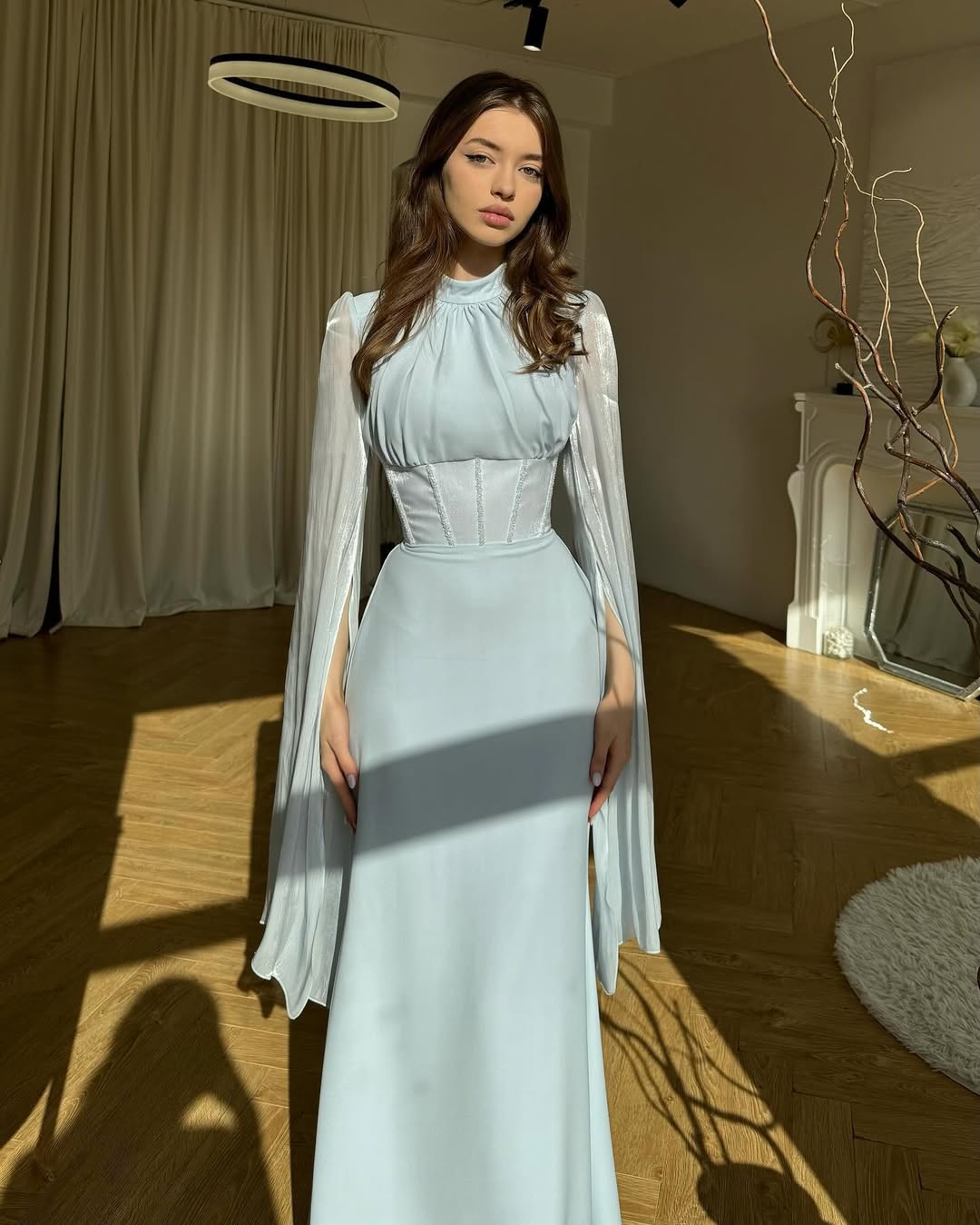 ​These are exaggerated floor-length "wing" sleeves. They are attached at the shoulder with subtle puffing and remain open from the elbow down, creating a fluid, cape-like effect whenever the arms move.