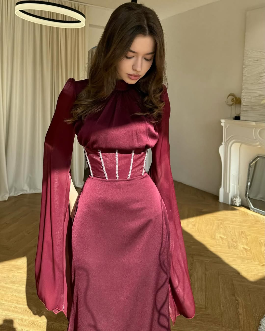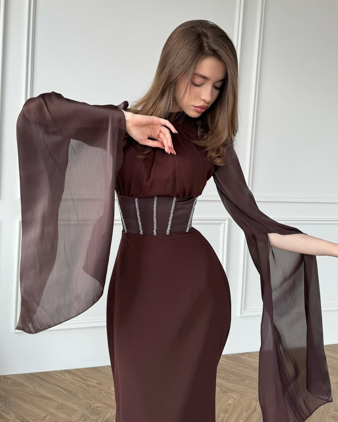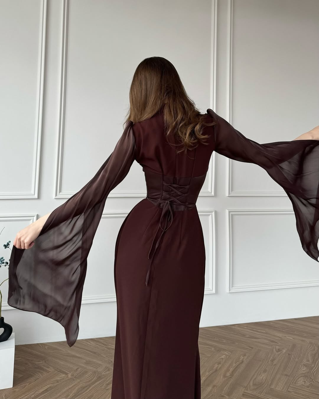 ​The dress utilizes a matte-finish textile with a slight sheen, giving it a sophisticated, weighted look. The contrast between the sheerer quality of the sleeves and the opaque, structured body adds visual depth.