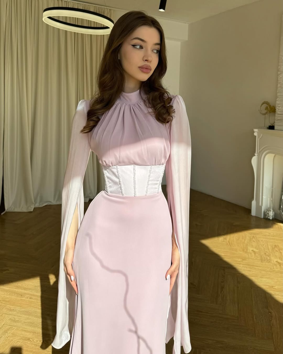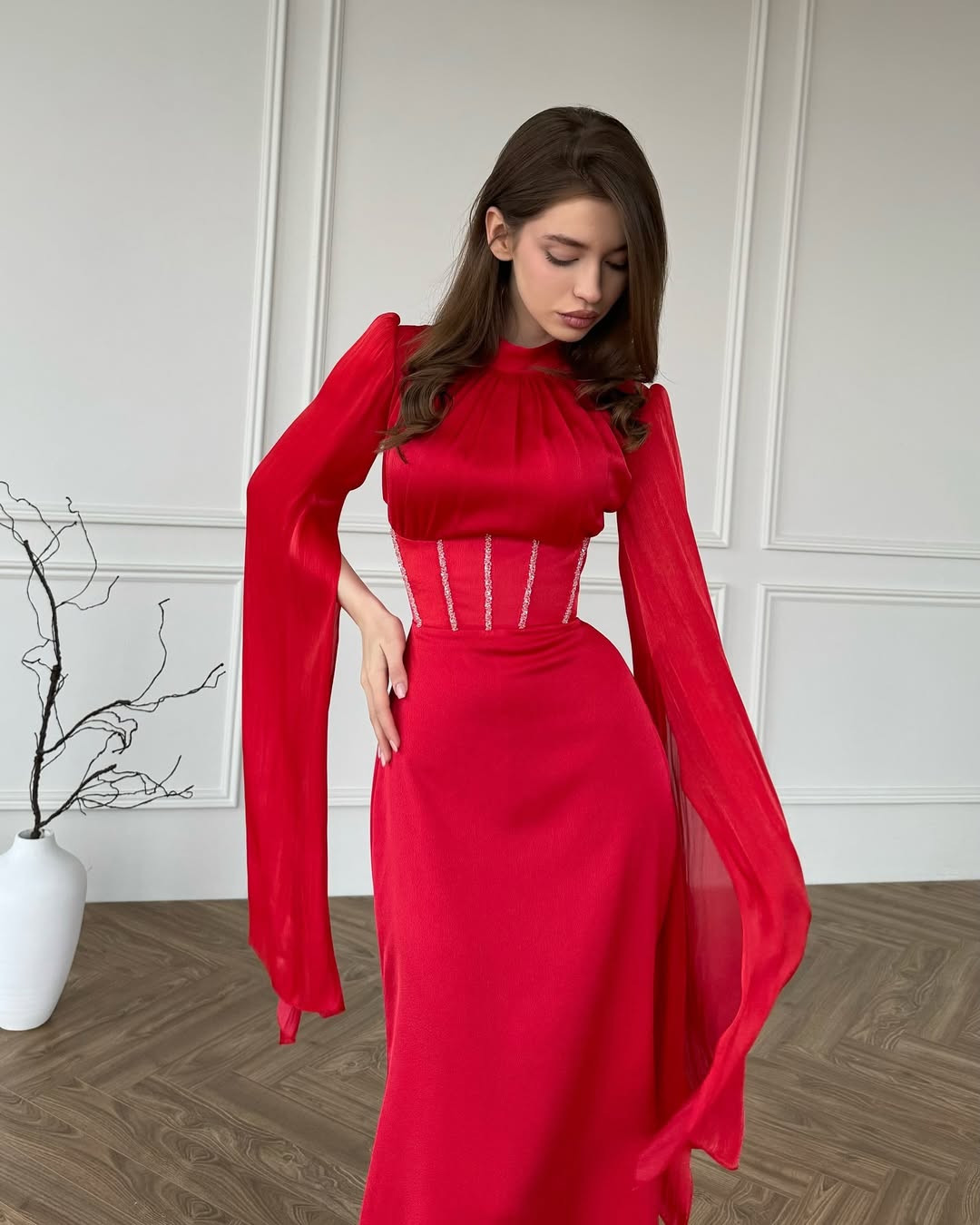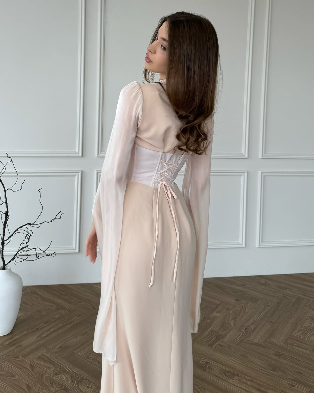 ​The dress utilizes a matte-finish textile with a slight sheen, giving it a sophisticated, weighted look. The contrast between the sheerer quality of the sleeves and the opaque, structured body adds visual depth.