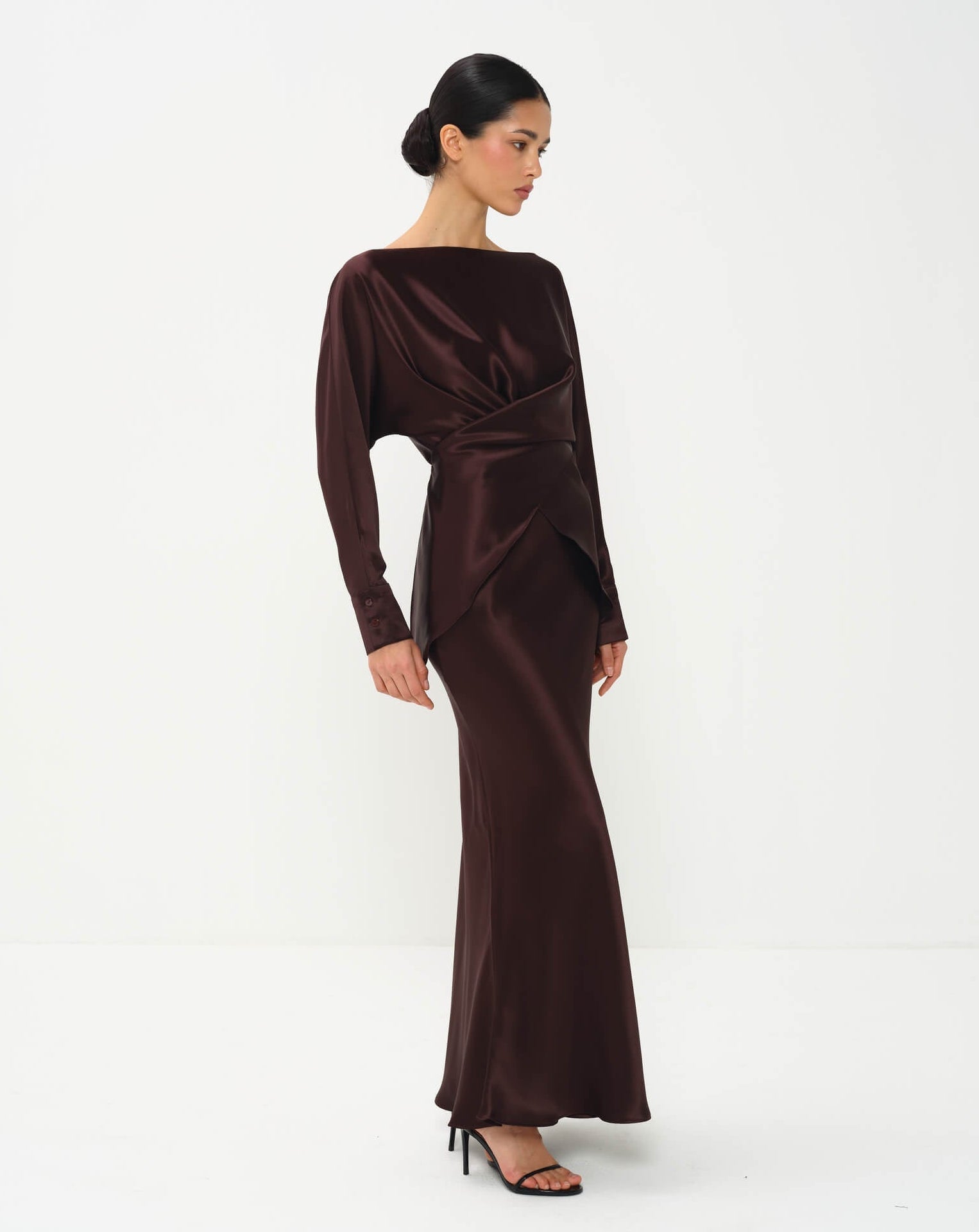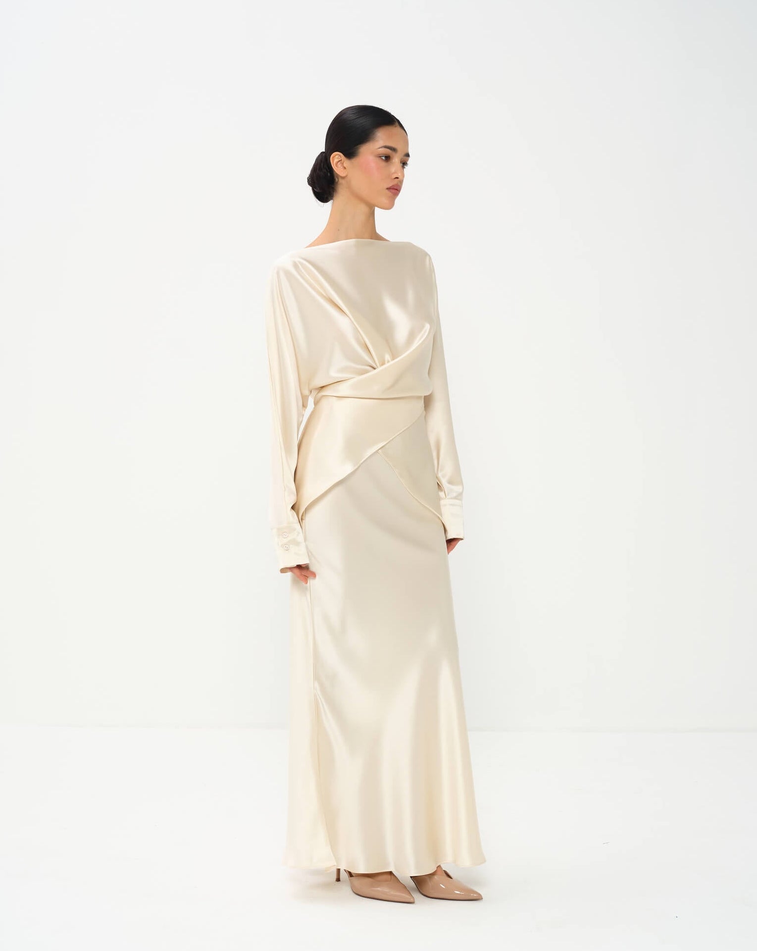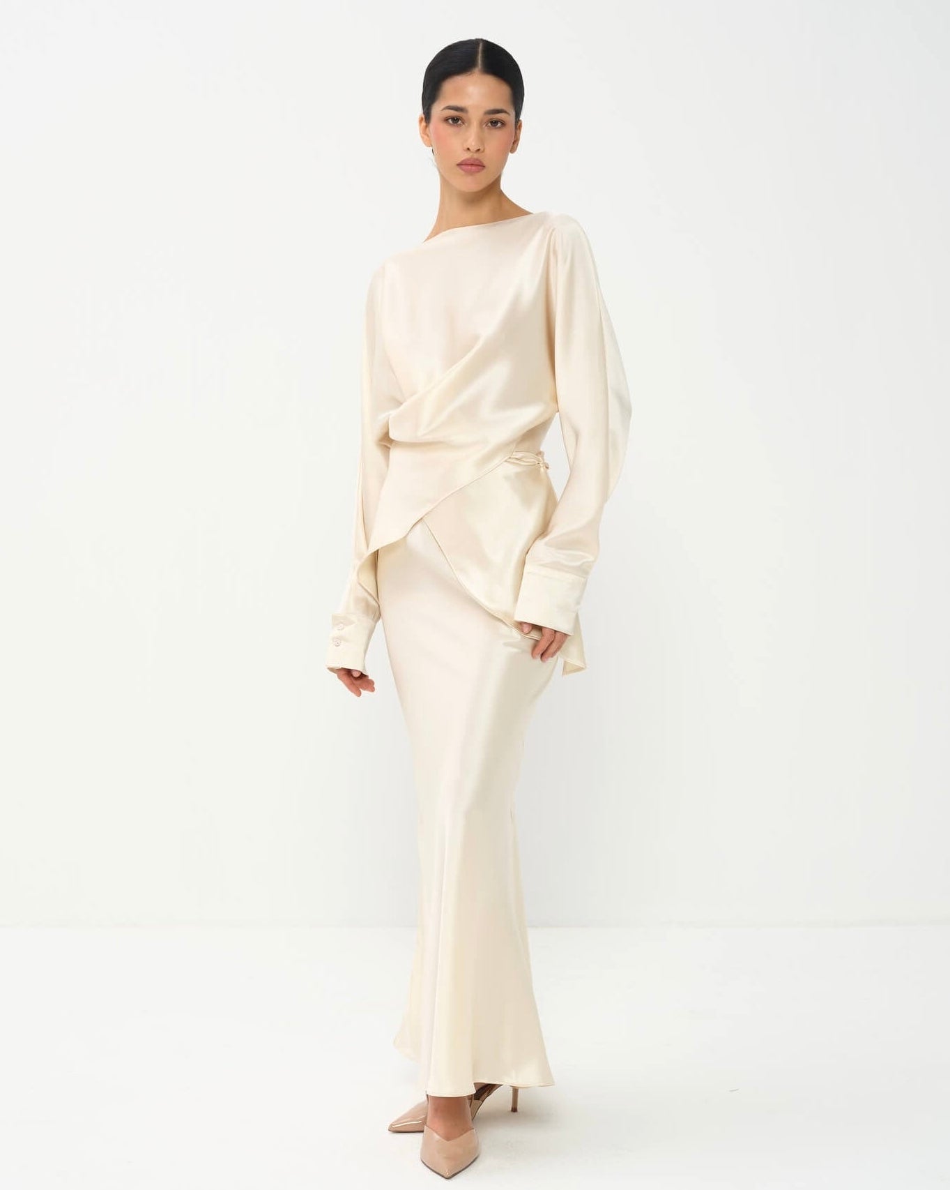 • Fabrication: Constructed from a heavy silk charmeuse or liquid satin, chosen for its high-luster finish and ability to hold soft, architectural folds.