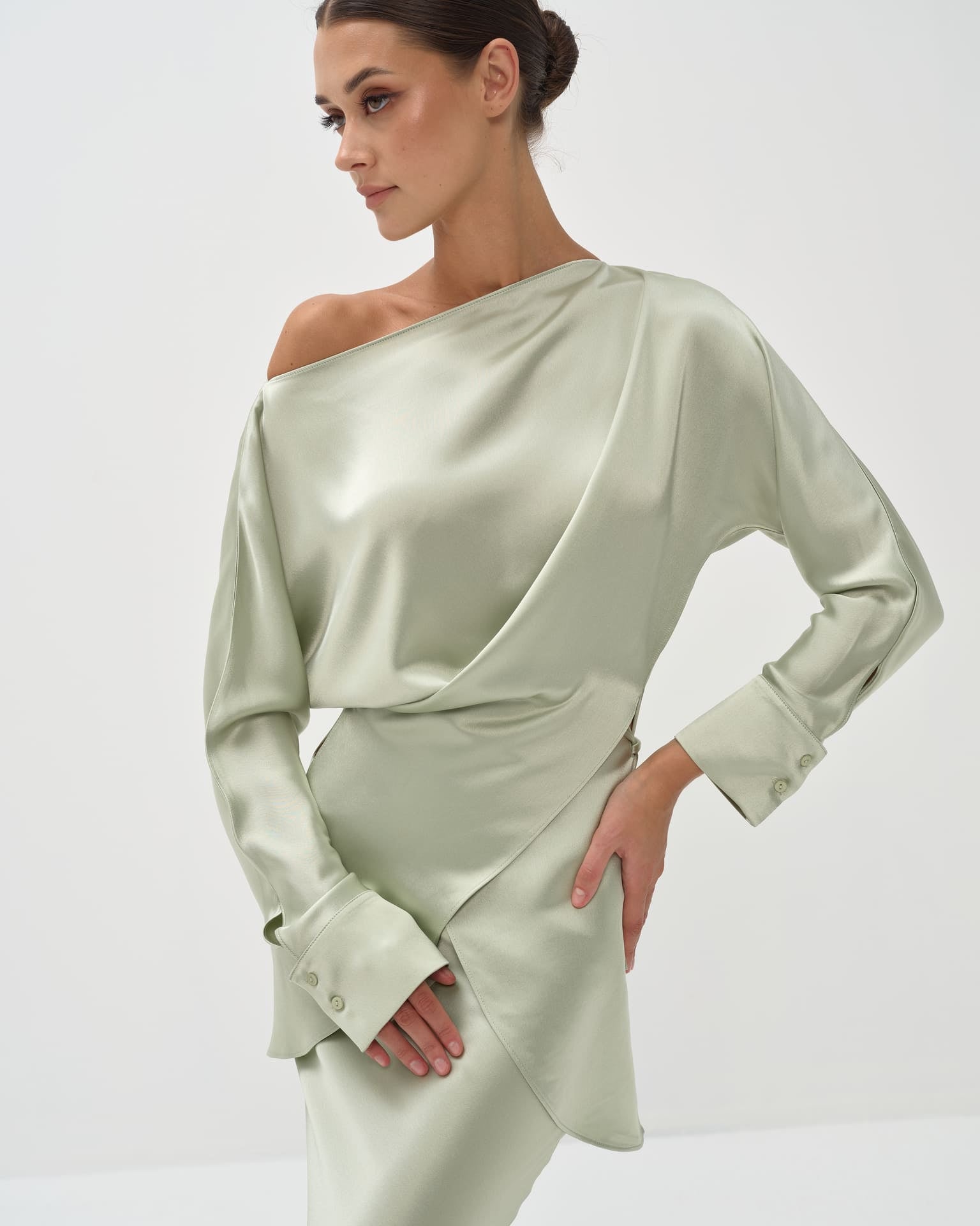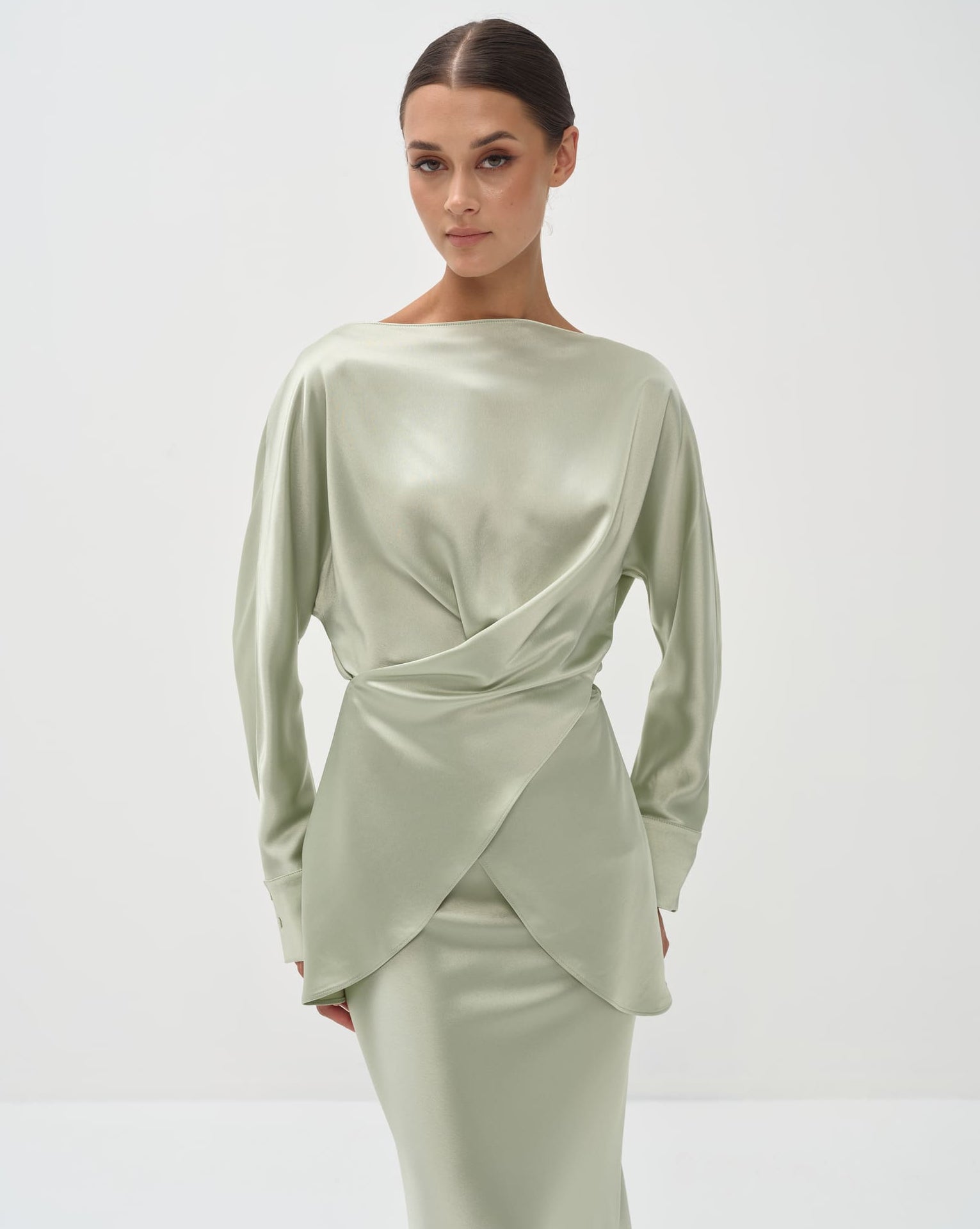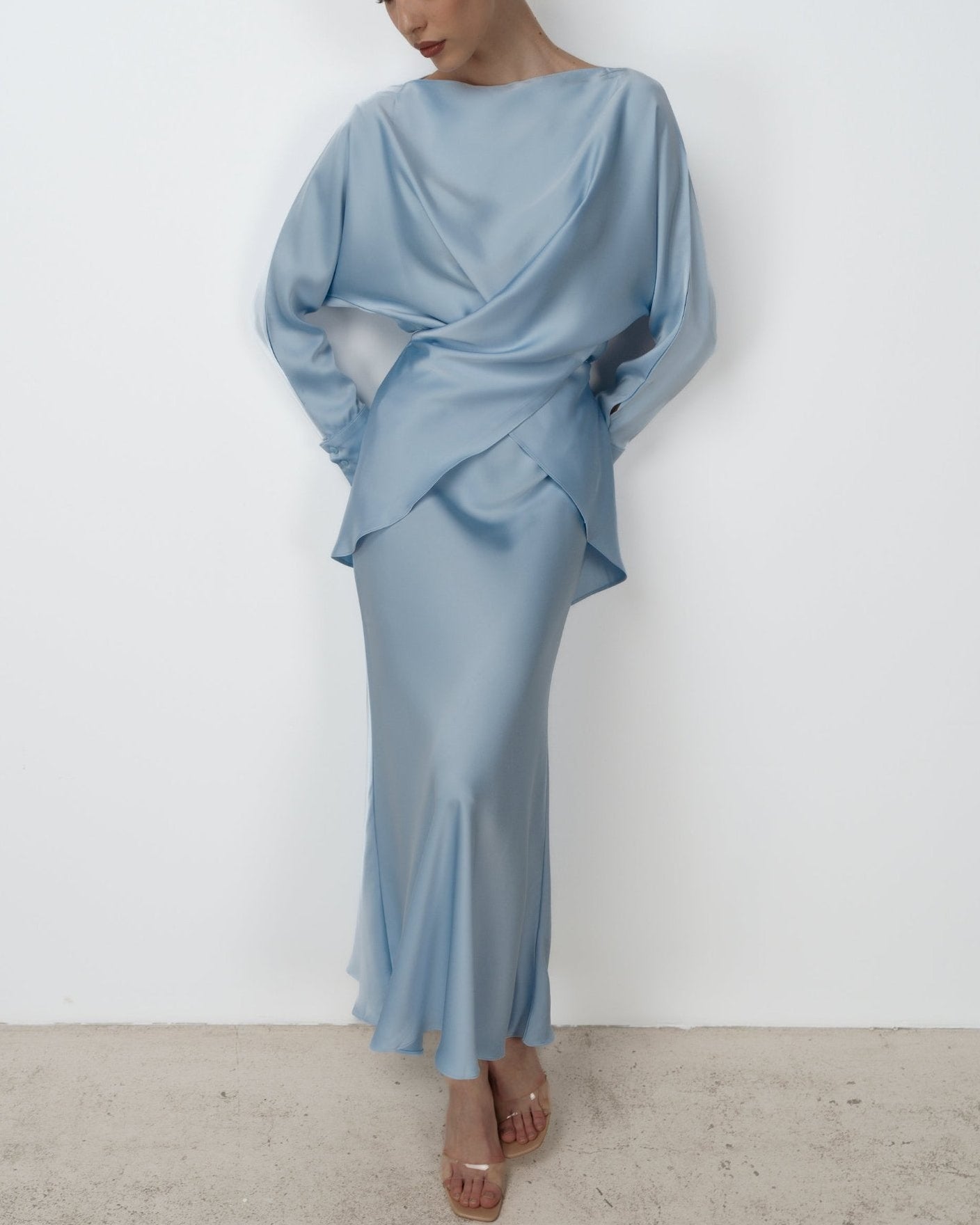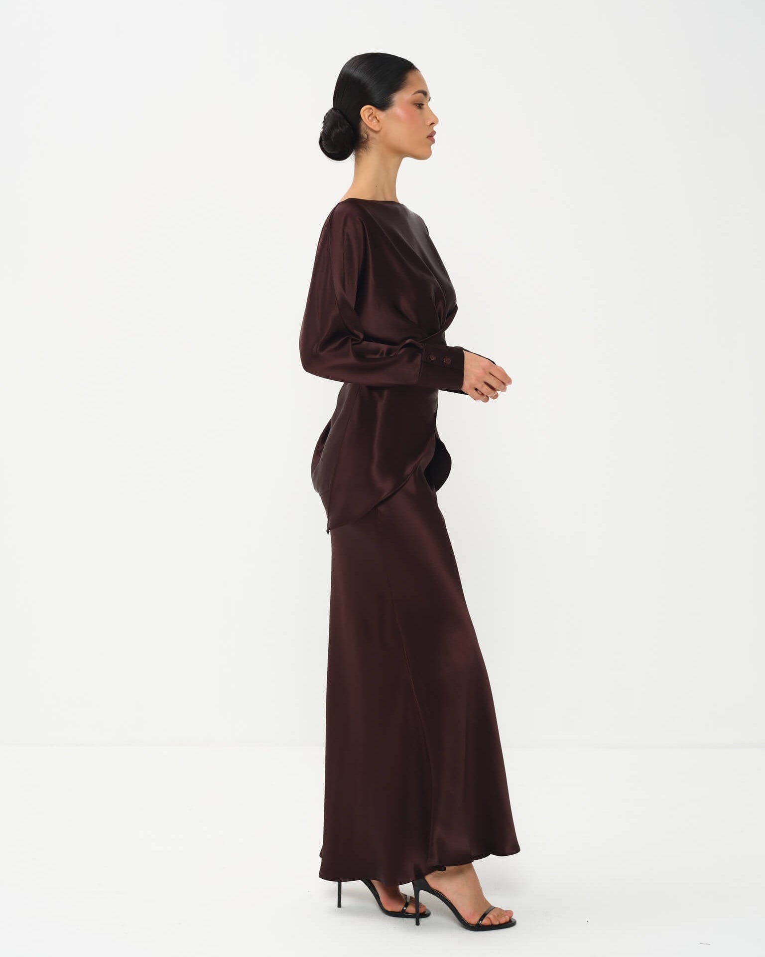 • Fabrication: Constructed from a heavy silk charmeuse or liquid satin, chosen for its high-luster finish and ability to hold soft, architectural folds.