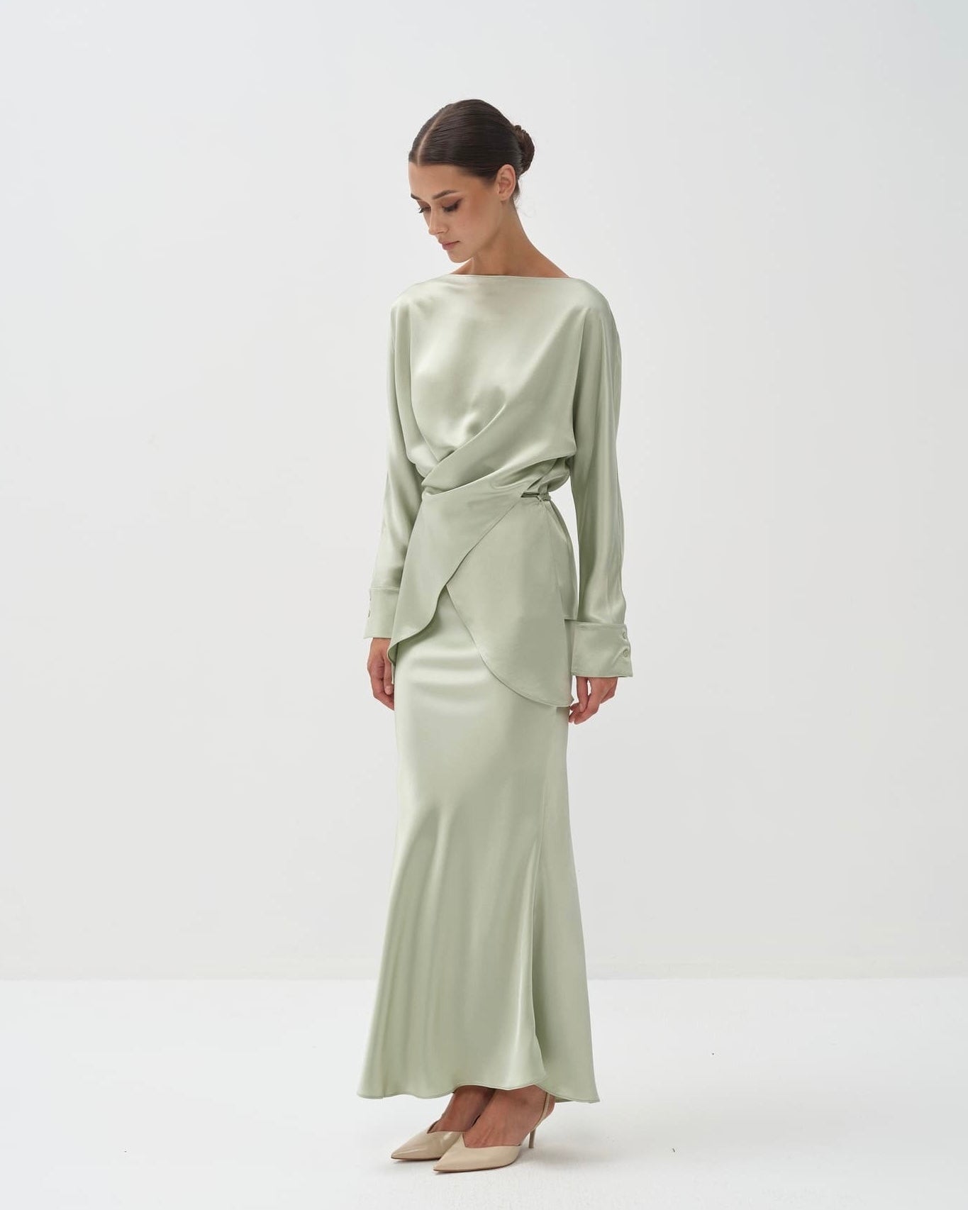 • Silhouette: A floor-length column silhouette with a subtle bias-cut flare at the hem to create fluid movement.