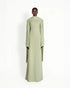 • Neckline: A structured mandarin collar trimmed with delicate seed pearls.