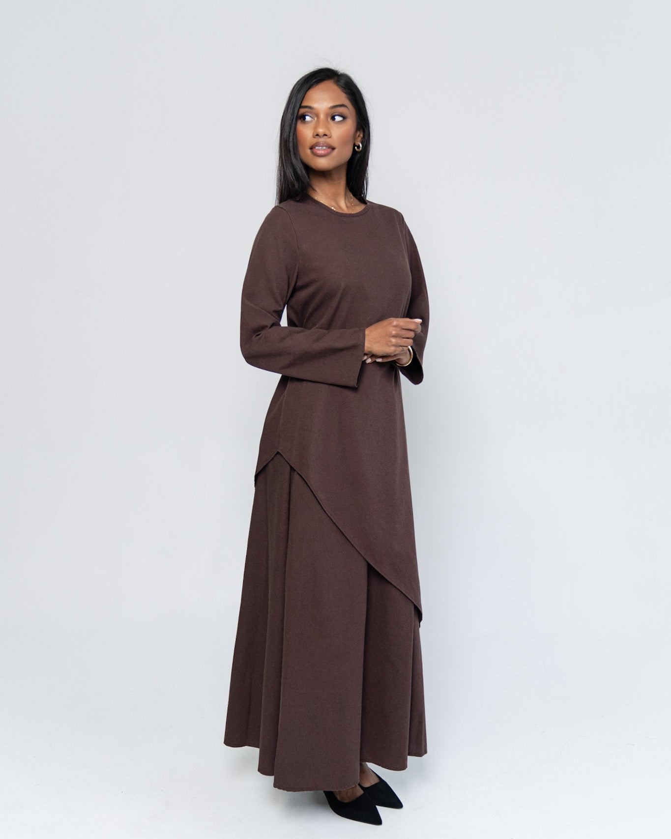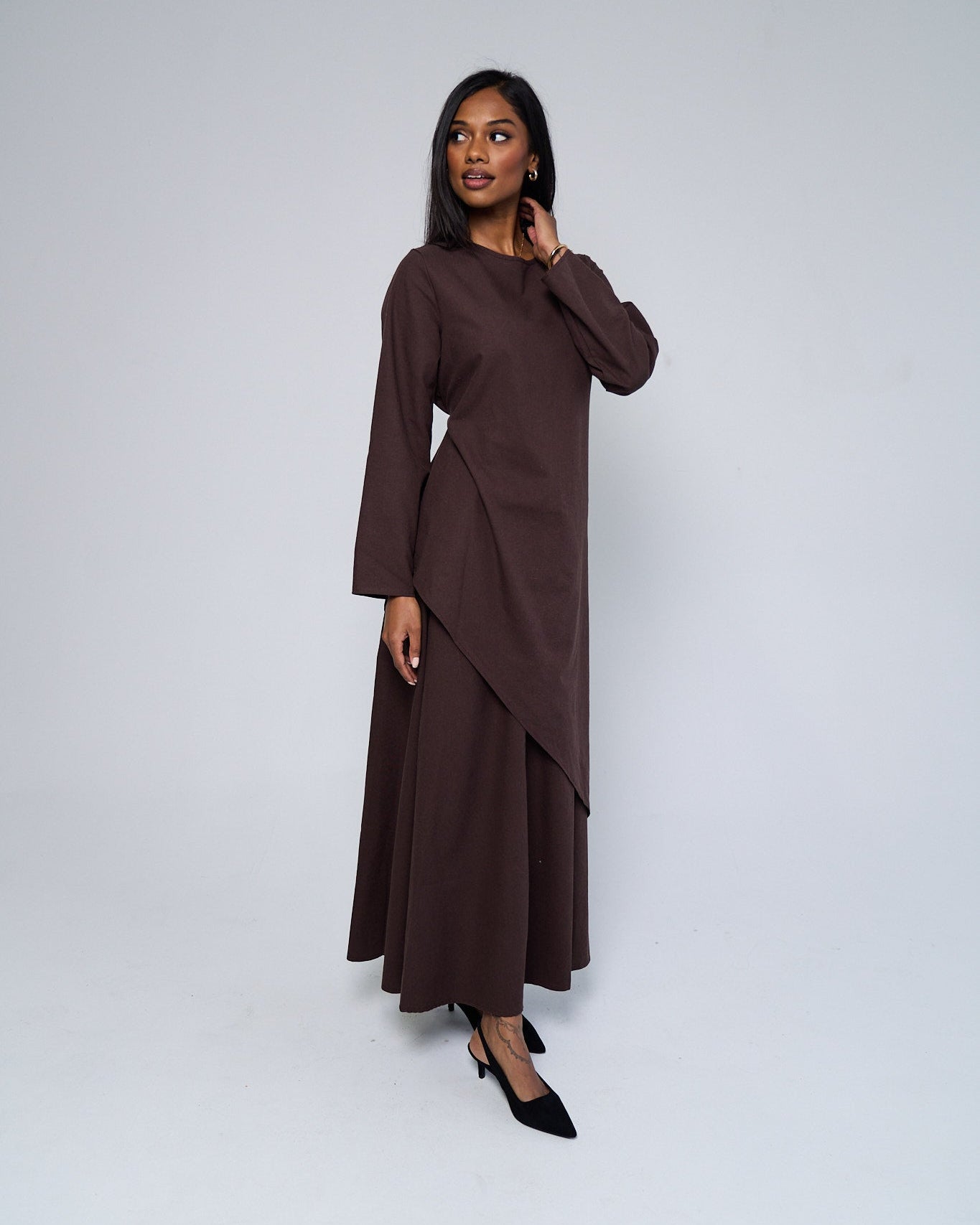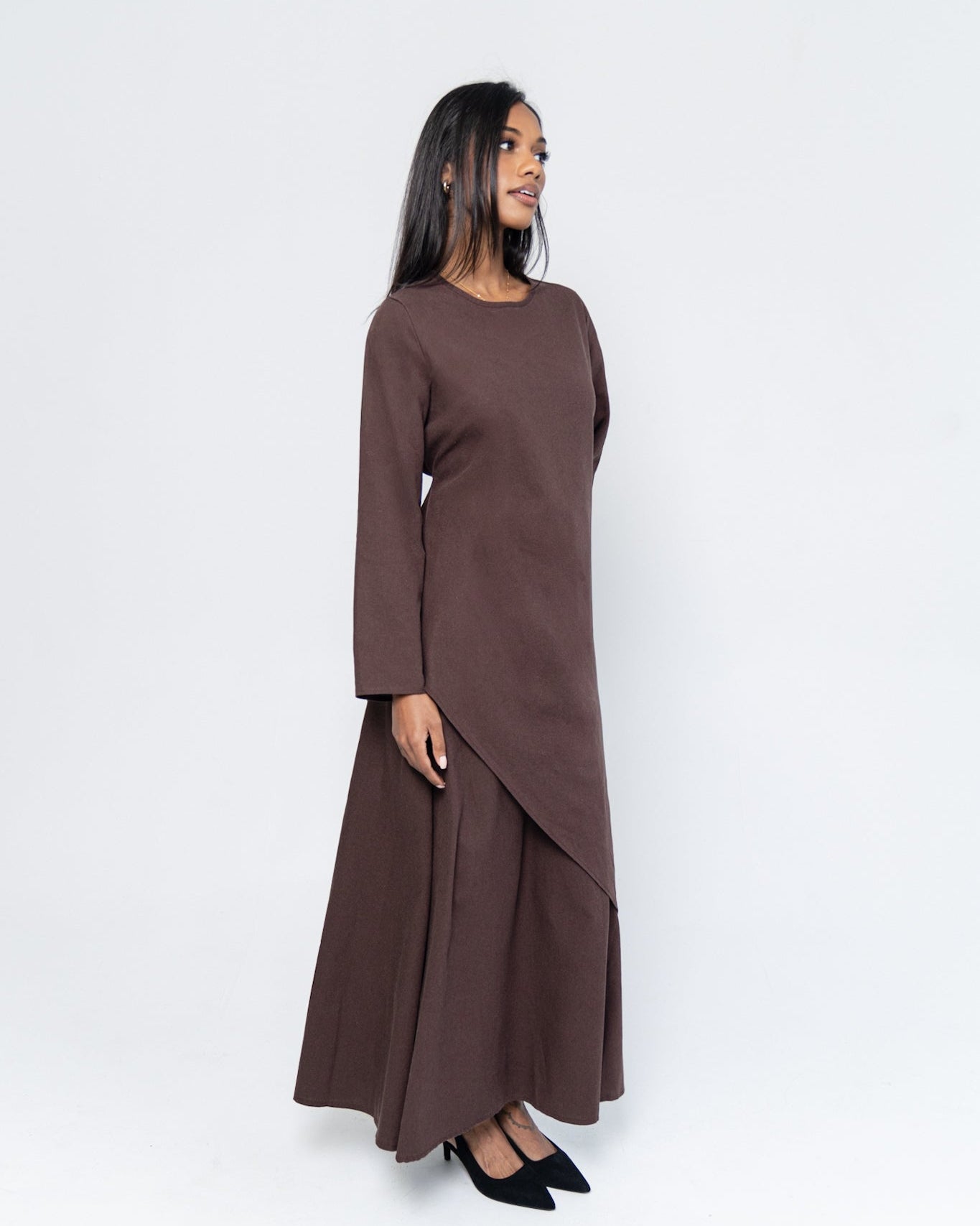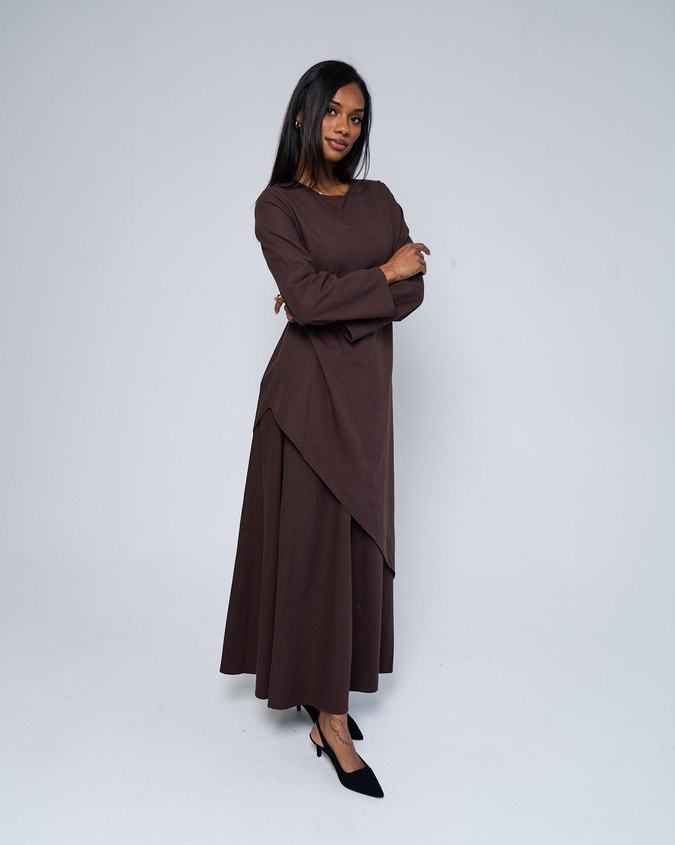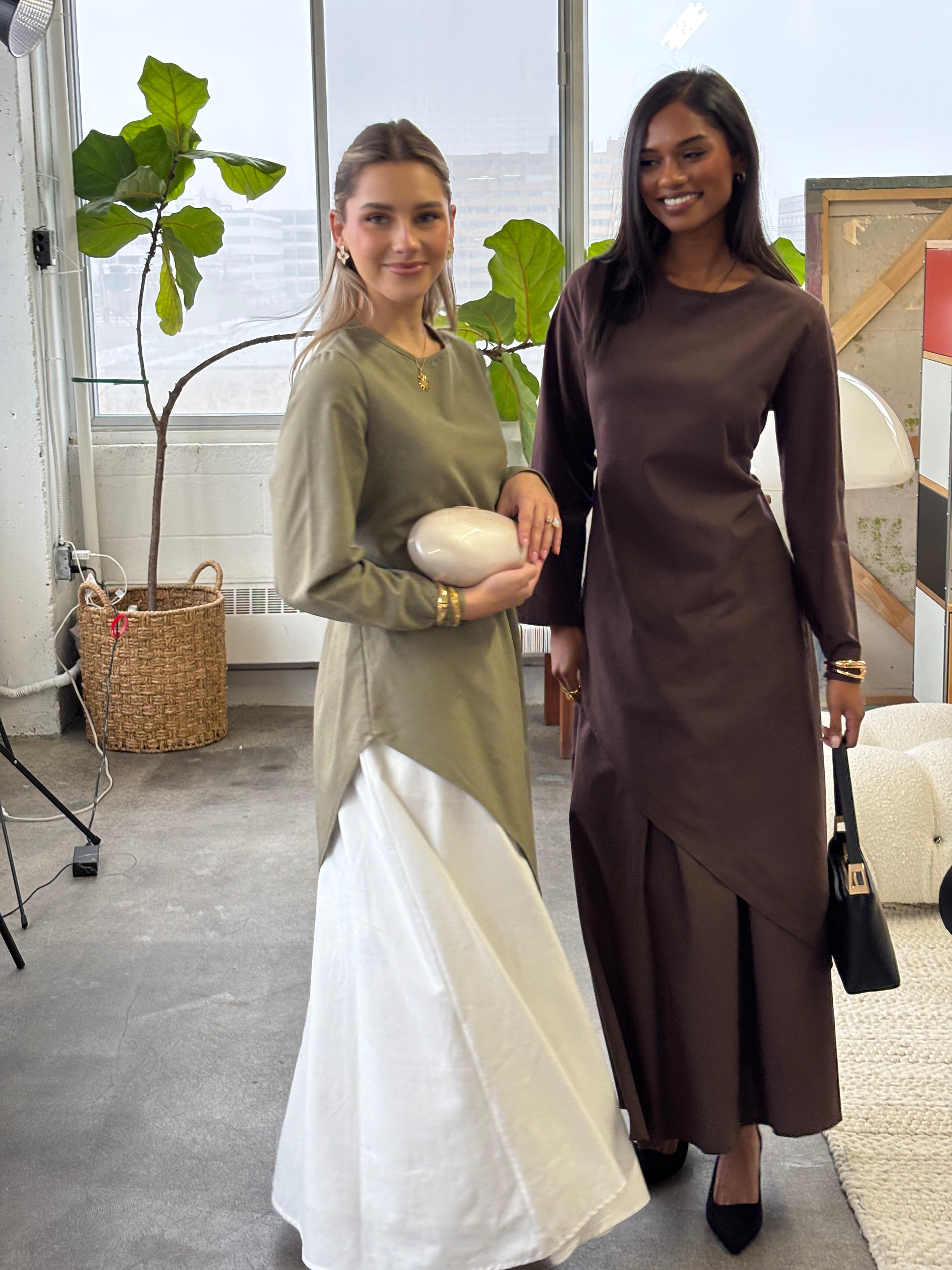 Each dress keeps the asymmetric wrap detail, the long modest silhouette, and the comfortable fit, but the colours create a calmer, more natural feel compared to the bold contrast of the Twin Flame Set.