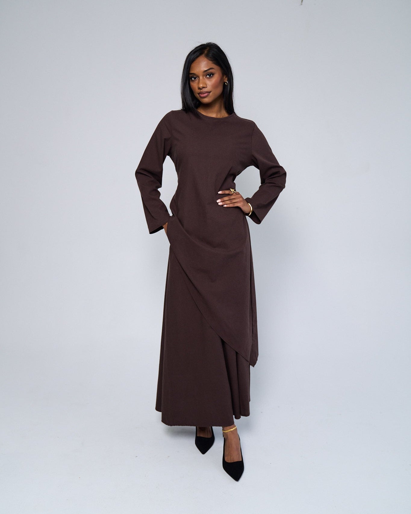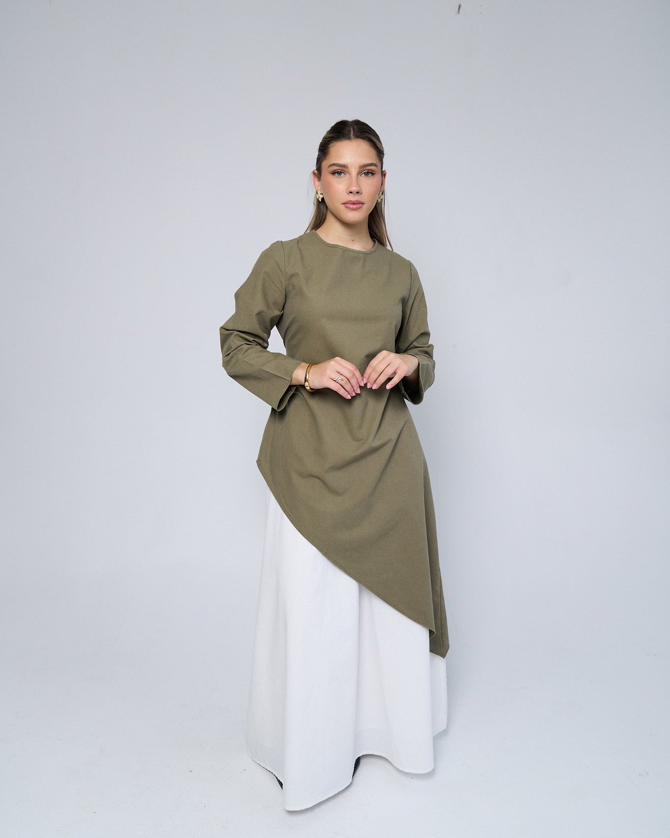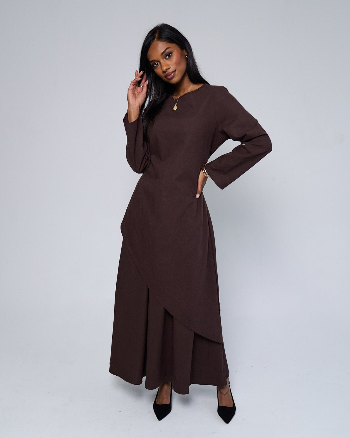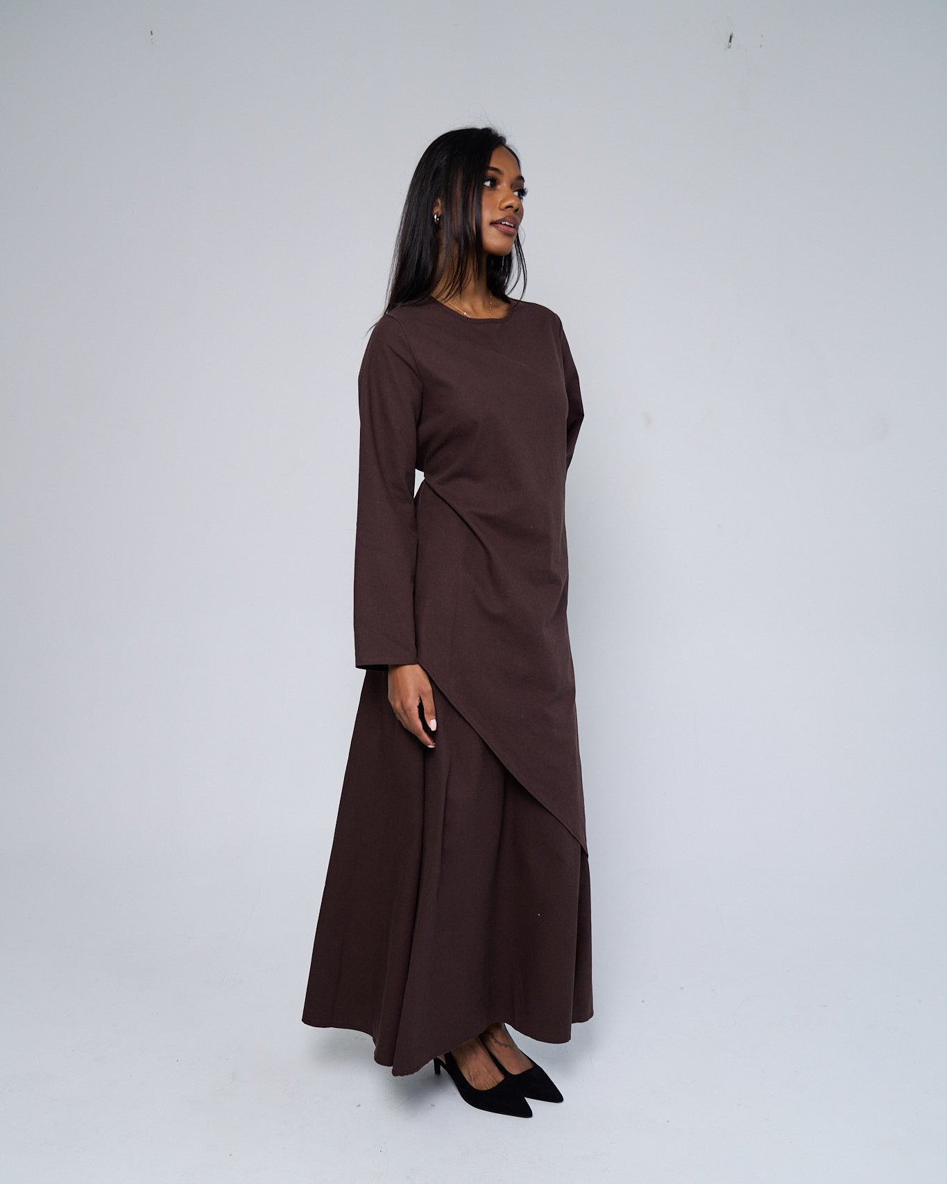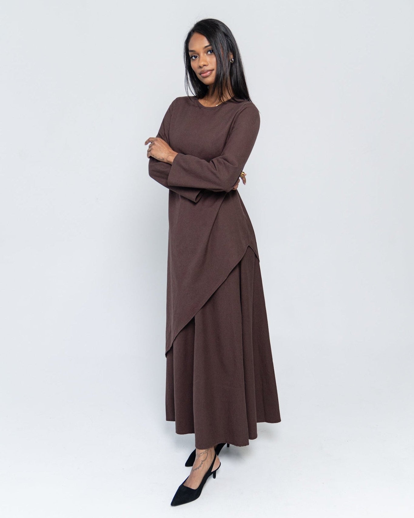 Each dress keeps the asymmetric wrap detail, the long modest silhouette, and the comfortable fit, but the colours create a calmer, more natural feel compared to the bold contrast of the Twin Flame Set.
