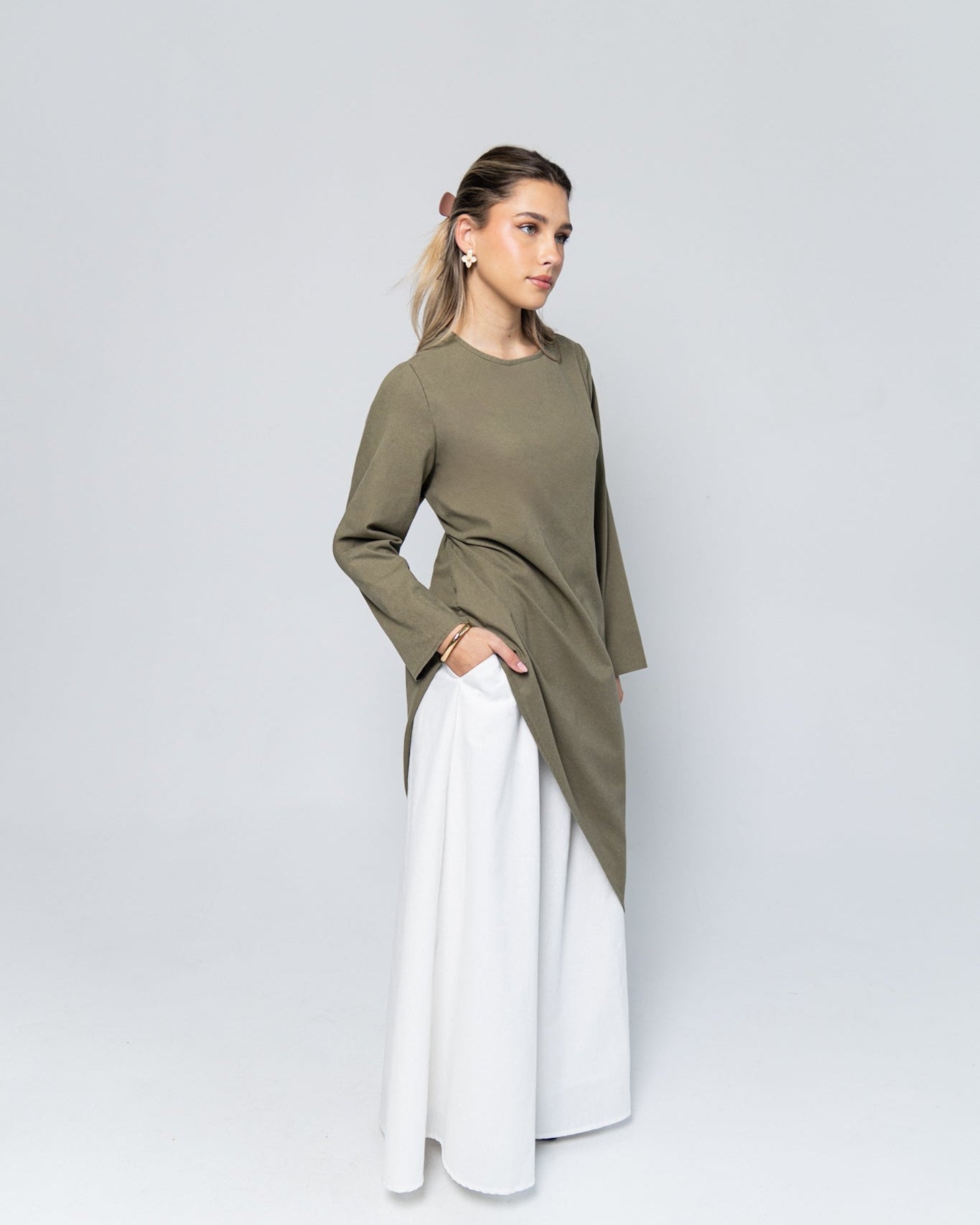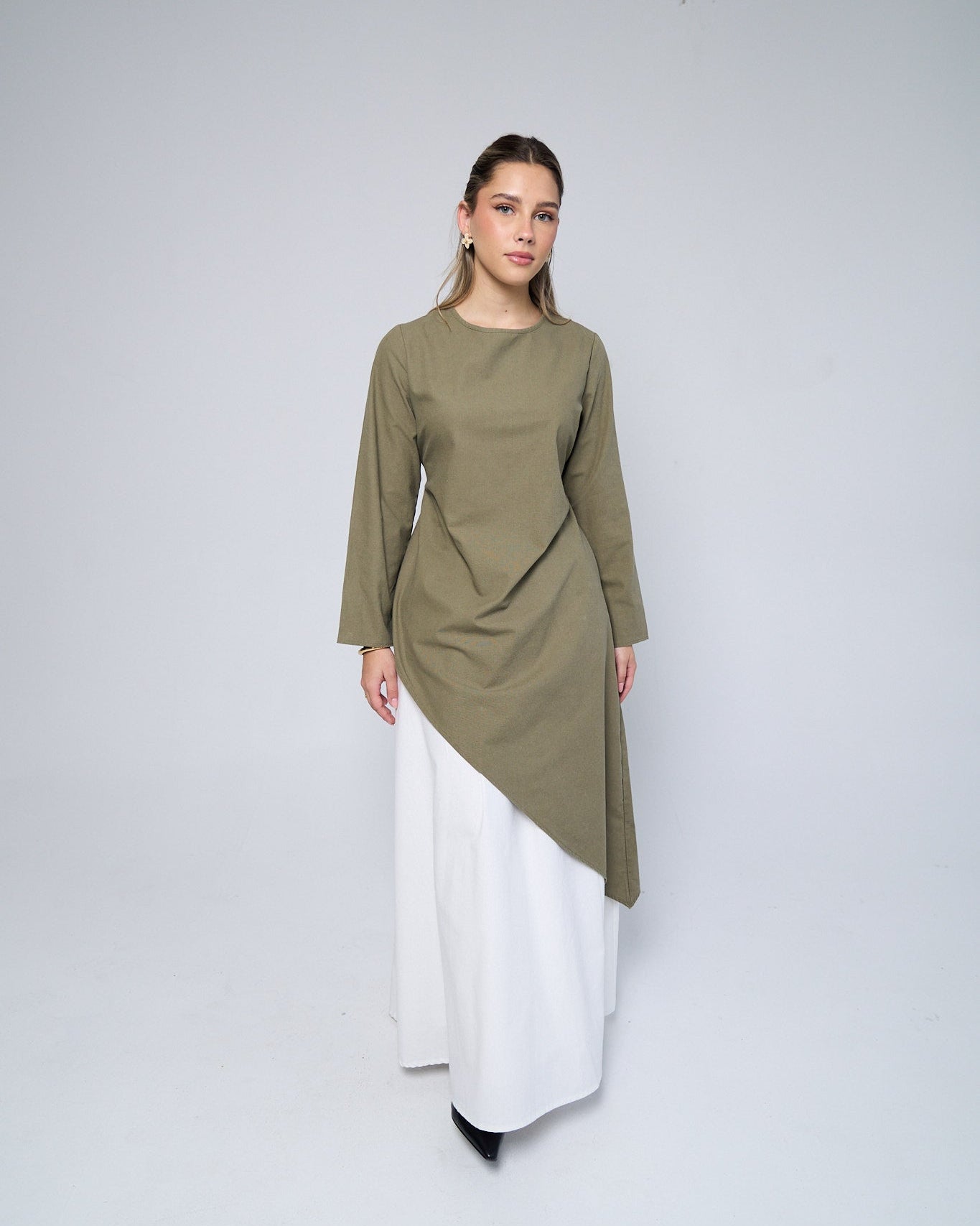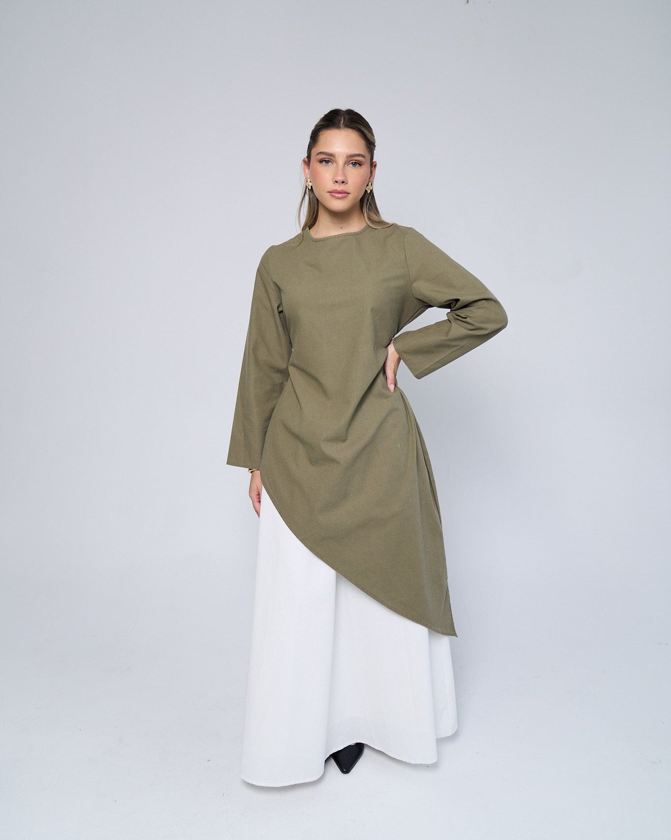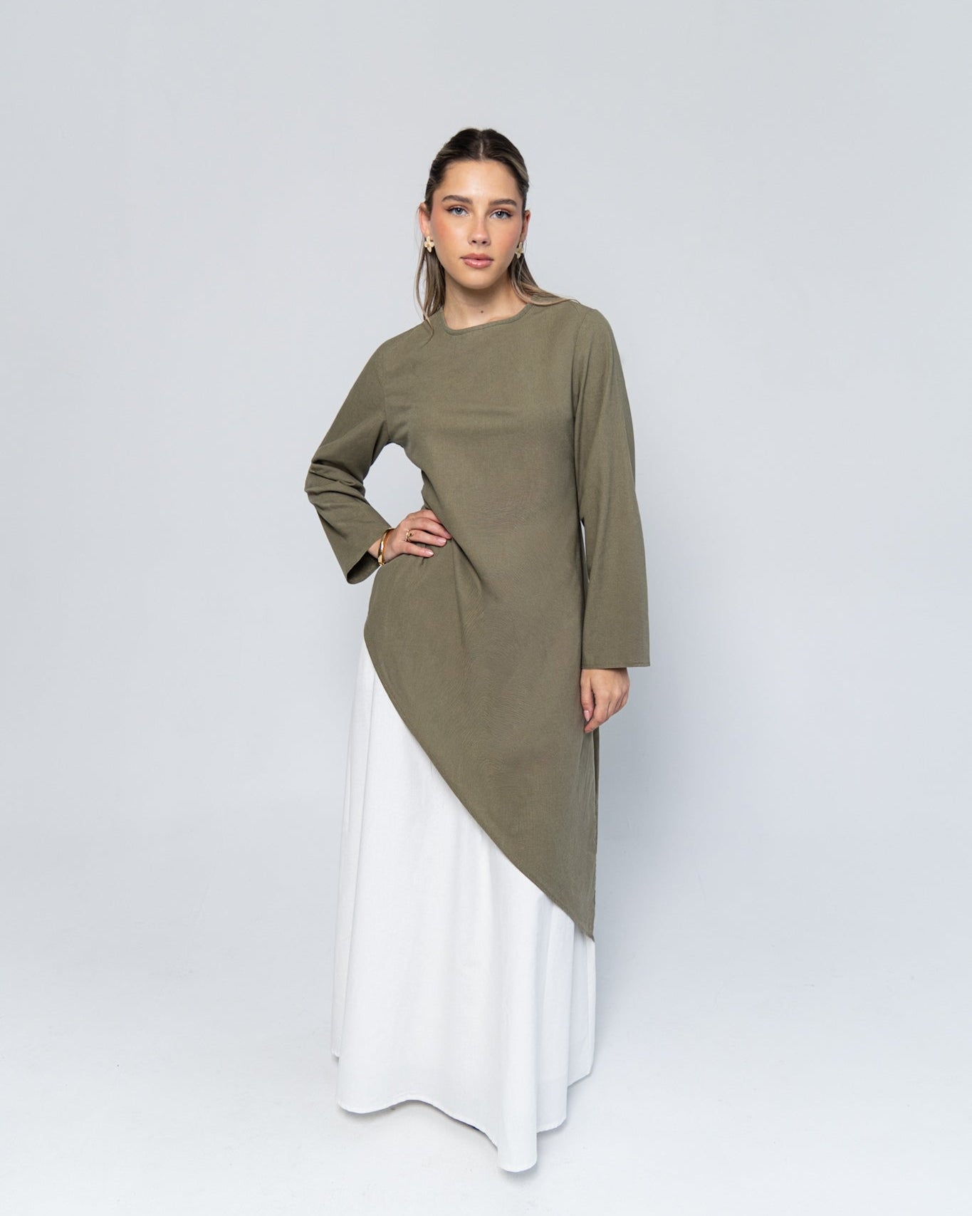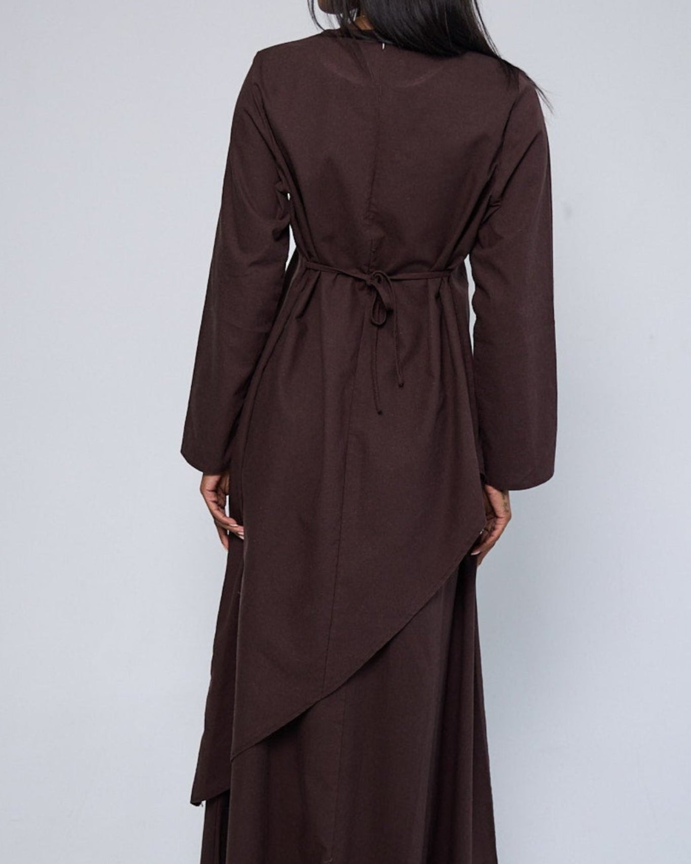 Each dress keeps the asymmetric wrap detail, the long modest silhouette, and the comfortable fit, but the colours create a calmer, more natural feel compared to the bold contrast of the Twin Flame Set.