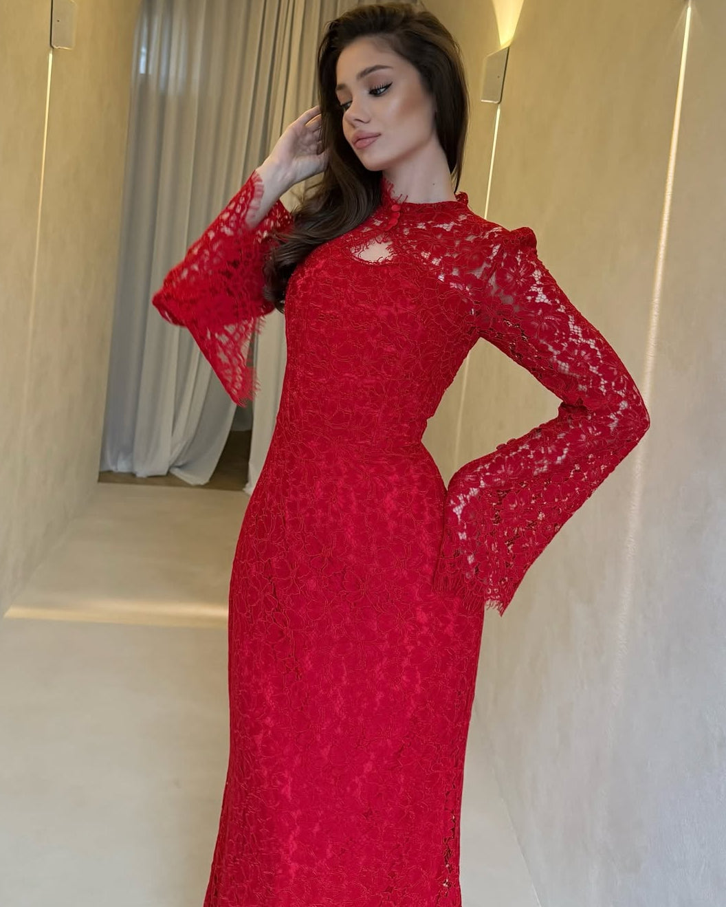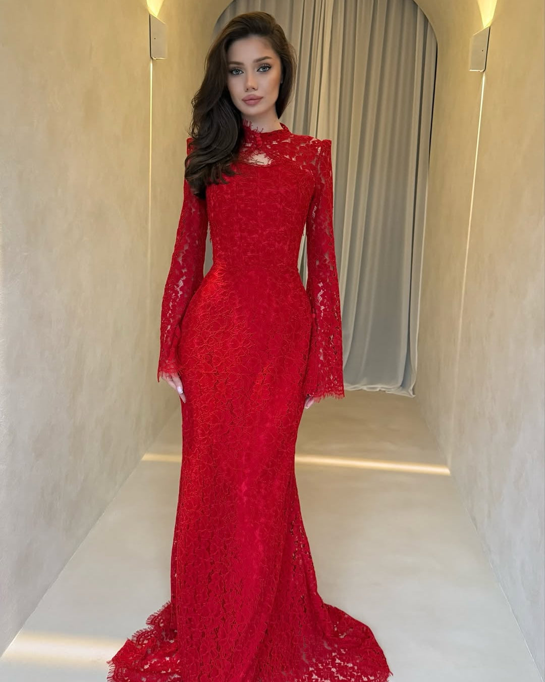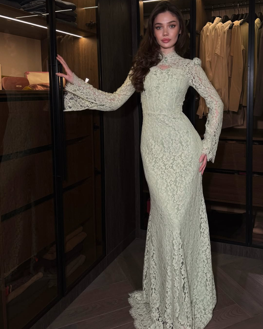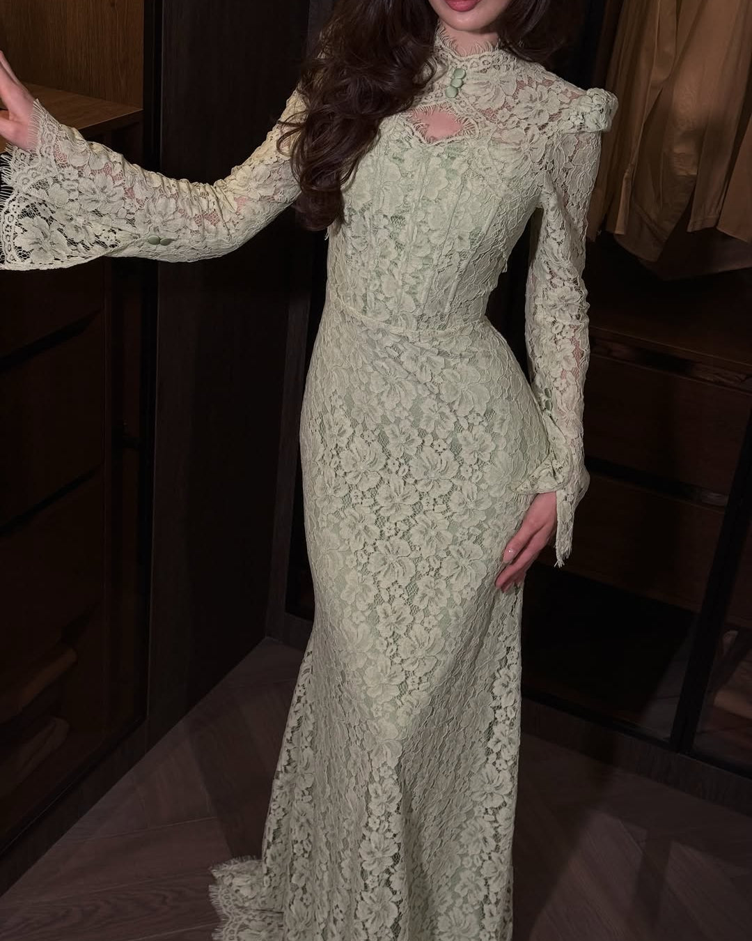 • Hemline: A graceful scalloped train that pools slightly at the feet, highlighting the detailed patterns of the lace.