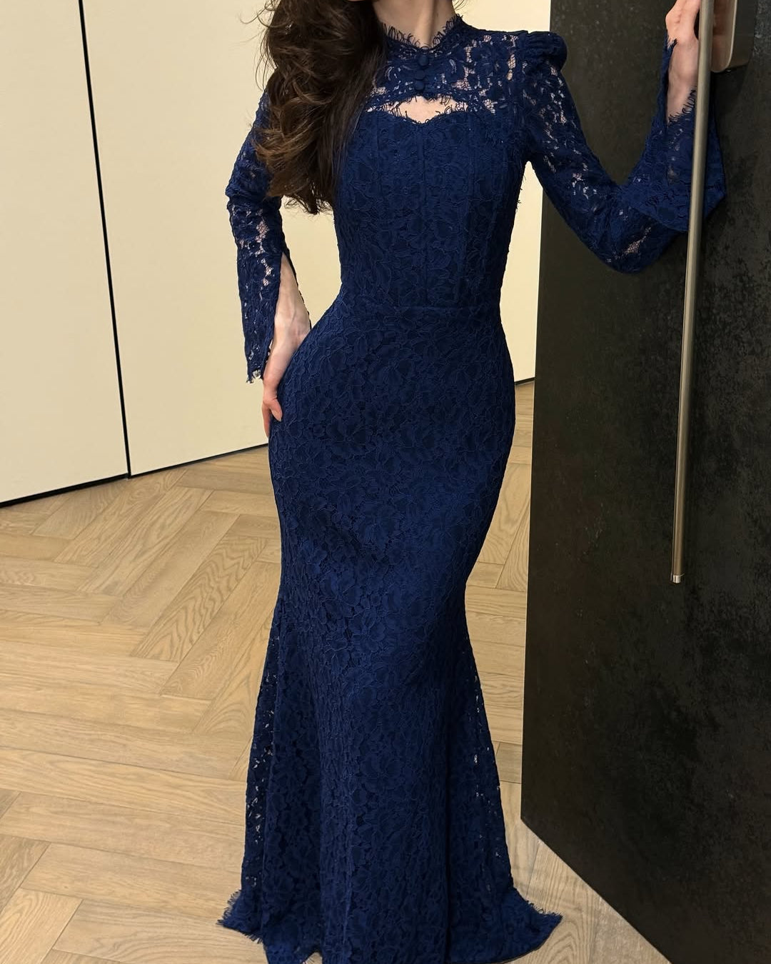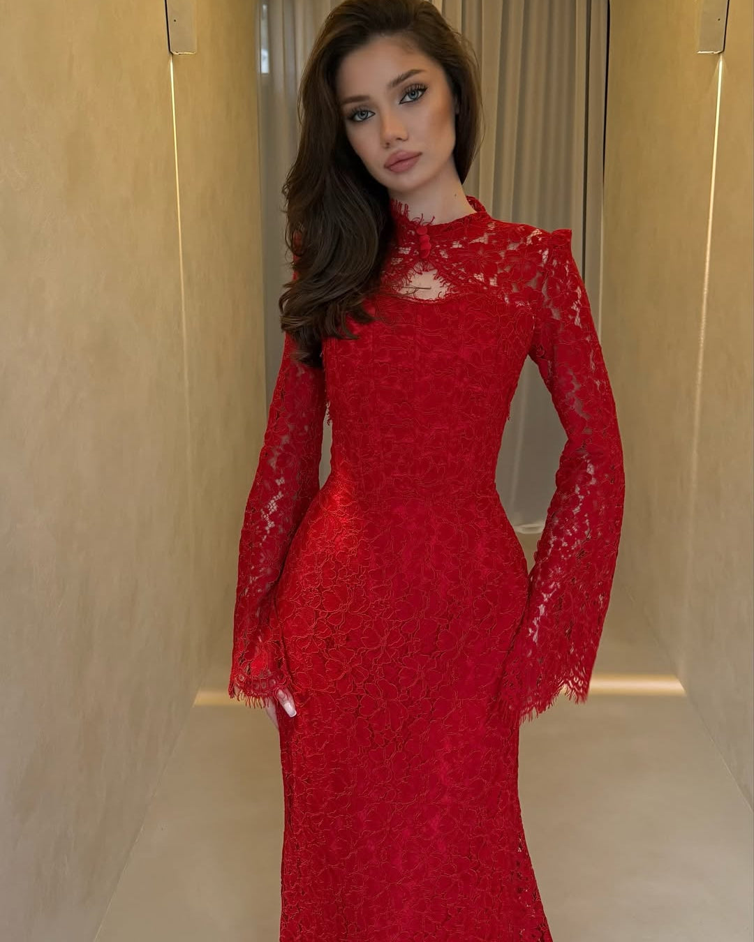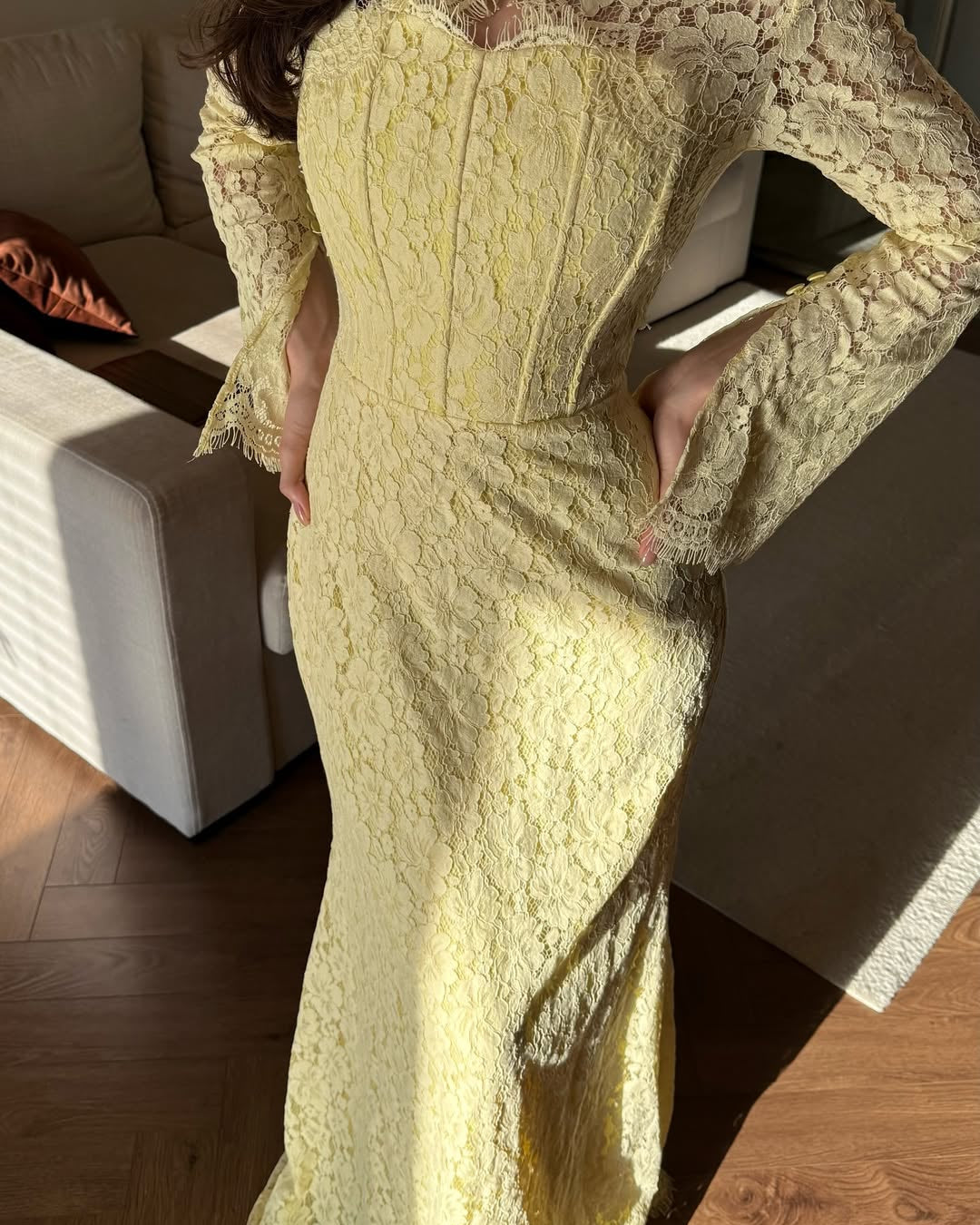 • Hemline: A graceful scalloped train that pools slightly at the feet, highlighting the detailed patterns of the lace.