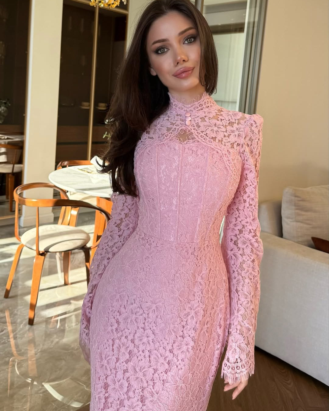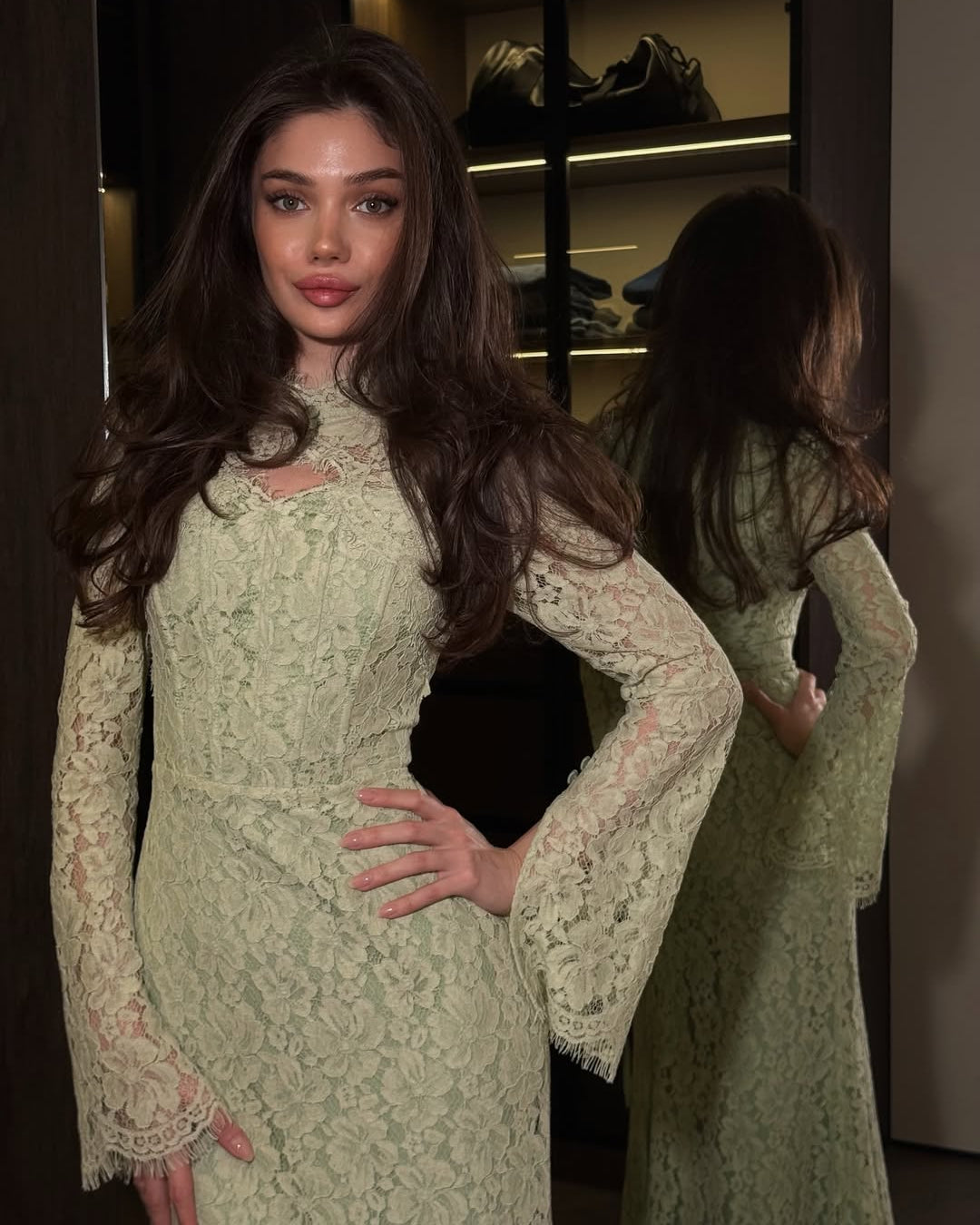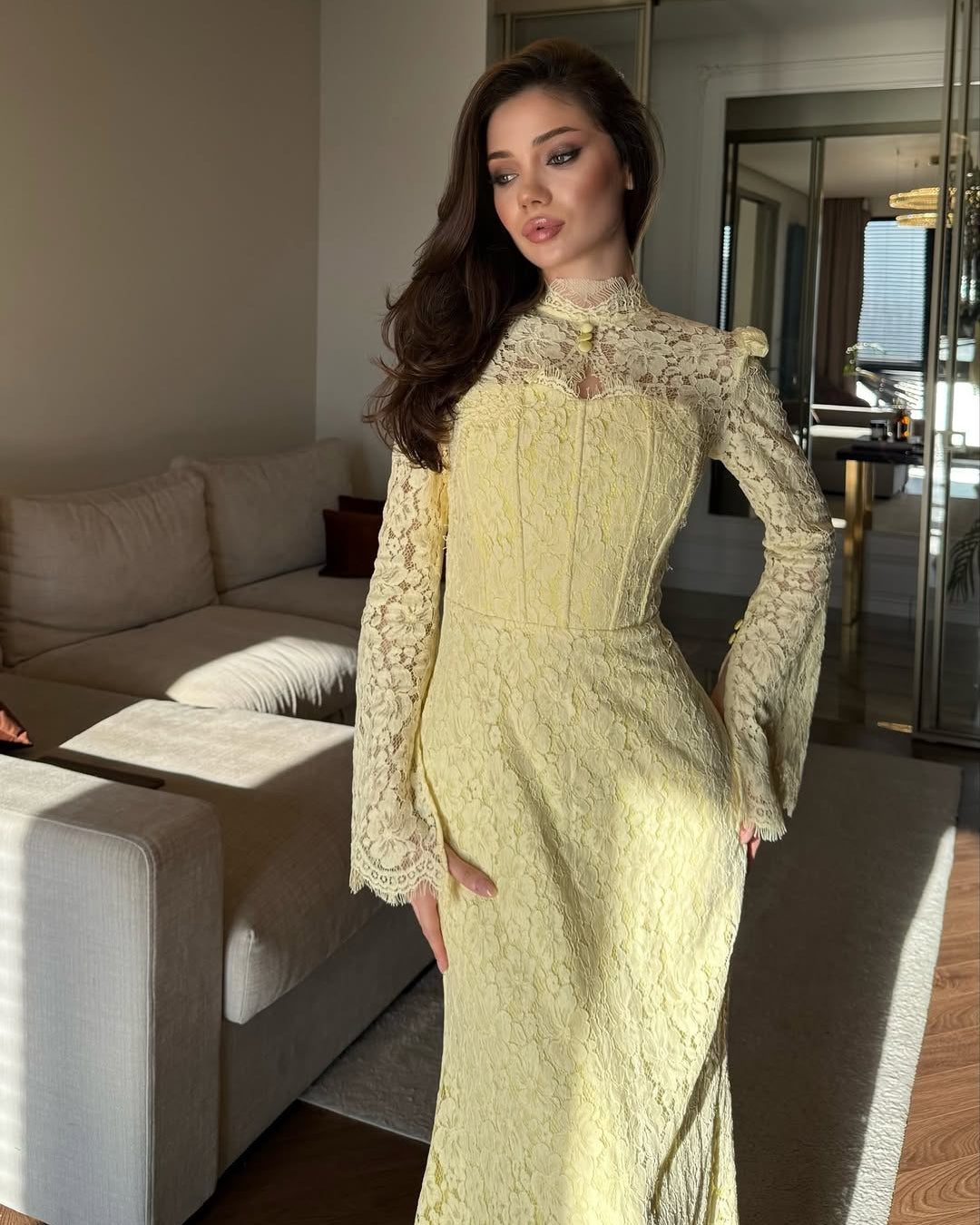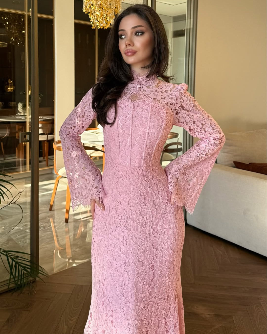 • Hemline: A graceful scalloped train that pools slightly at the feet, highlighting the detailed patterns of the lace.