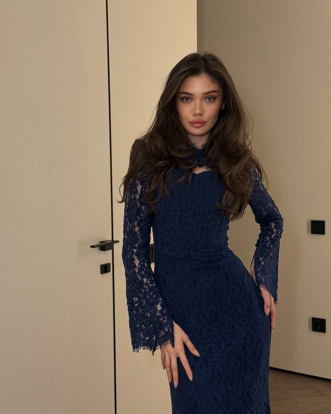 • Sleeves: Full-length bell sleeves that extend slightly over the hands, finished with flared, raw-edge lace cuffs.