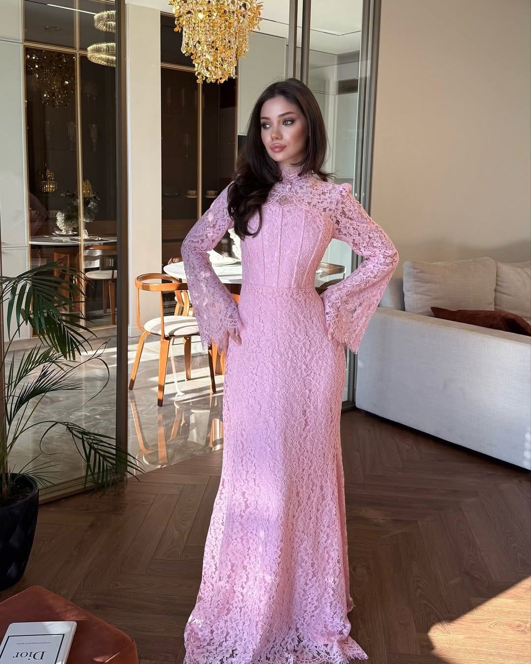 • Silhouette: A sleek floor-length mermaid or trumpet silhouette that fits closely through the bodice and hips before gently flaring out at the hem.
