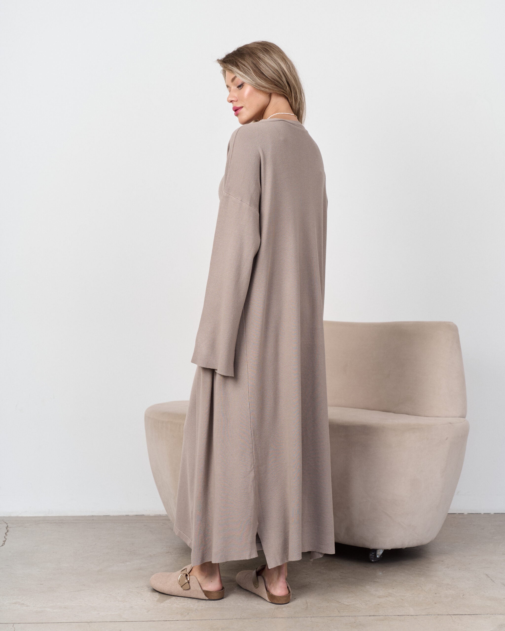 • Sleeves: Extra-long, wide-cut sleeves that lend a cozy, relaxed aesthetic.